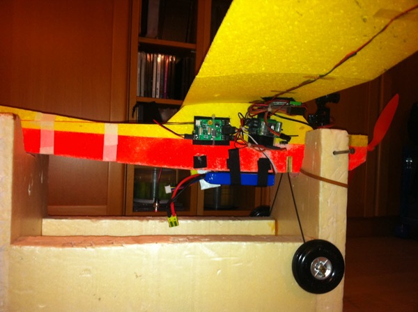 J’ai une batterie Lipo 3S (Turnigy 20-30C) de 1500 mA qui me sert d’accu de propulsion et d’alimentation pour la chaine vidéo (Tx et Caméra). La batterie pèse a elle seule 133g. Il est aussi équipé de diodes de couleurs (set Hobbyking 3 couleurs rouge, verte et blanche).