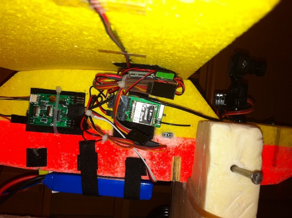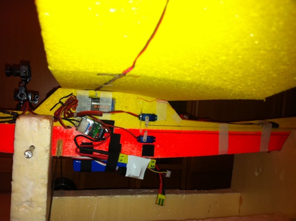 La caméra est positionnée sur le nez, en arrière du moteur. J’ai constaté que la rotation de l’hélice ne gène pas la vision. Je controle le mouvement pan/tilt soit avec les deux curseurs latéraux de la FF9, voies 8 et 9, soit avec le head tracker monté sur les lunettes Fat Shark et relié à la radio par la prise d’écolage.