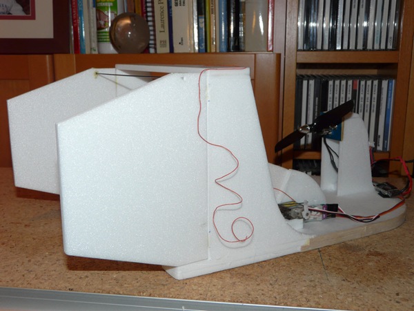 Les collages sont faits à la colle chaude, sauf le balsa sur la face avant ainsi que le guignol et la tige carbone entre les dérive, collés à la PU.