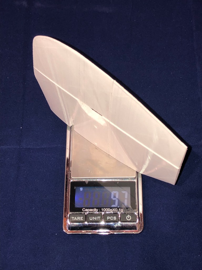 Current total weight of all parts is 282 g. I will need to add 2 9g servos, one receiver, motor+esc and the 2S 300mAh lipo battery, and all links and rods with rudder and elevator. Final weight should be around 420/430g.