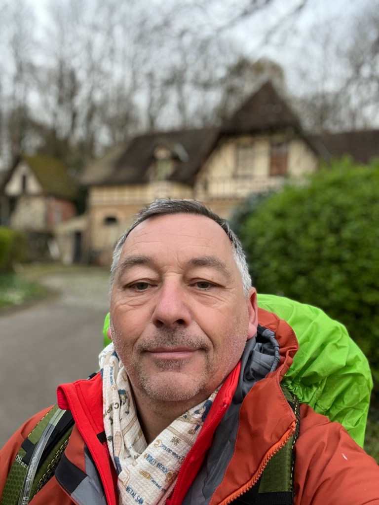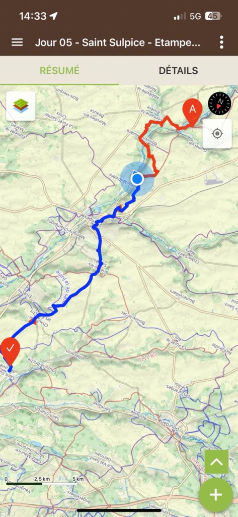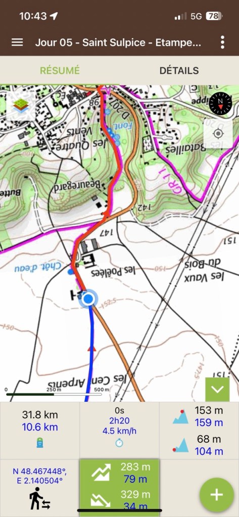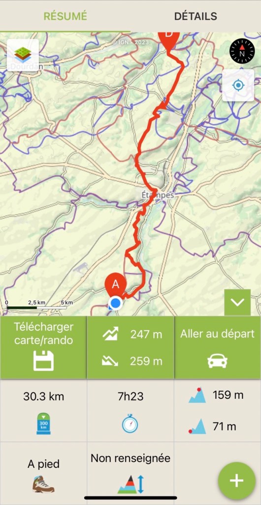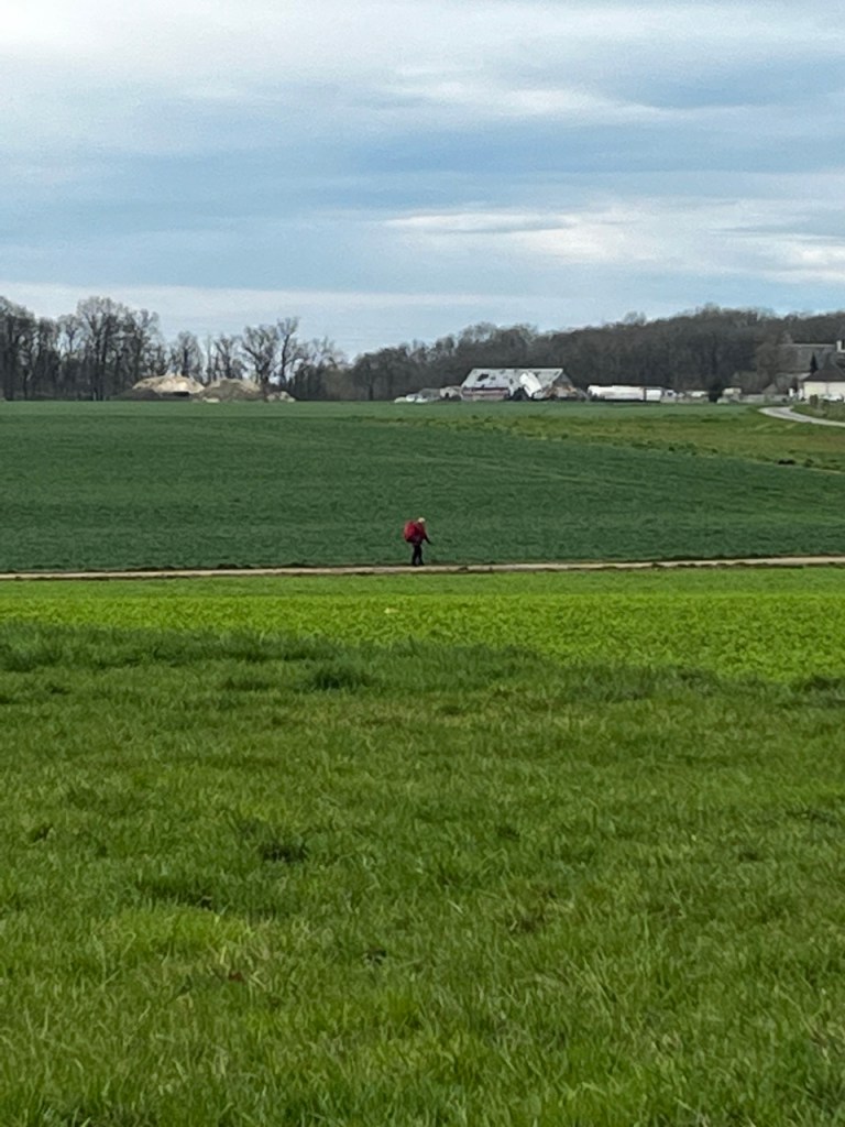 Je croise des voies rapides, ou l’on me fait comprendre que je suis lent … je suis toujours les marques de coquilles où qu’elles soient et le balisage est bien fait. A l’approche du repas vers midi trente j’ai effectué 16km, mi parcours dans Etampes. Le ciel est toujours aussi bas en reprenant le chemin, à 14h30 je suis aux 2/3 la carte fait plaisir à voir. Sur ce en pleine plaine un hélico militaire fait un passage bas à la « Apocalypse now » , il est à moins de 30m du sol … ils m’ont sûrement repéré de loin sur cette plaine rase avec mes couleurs de caméléon !!