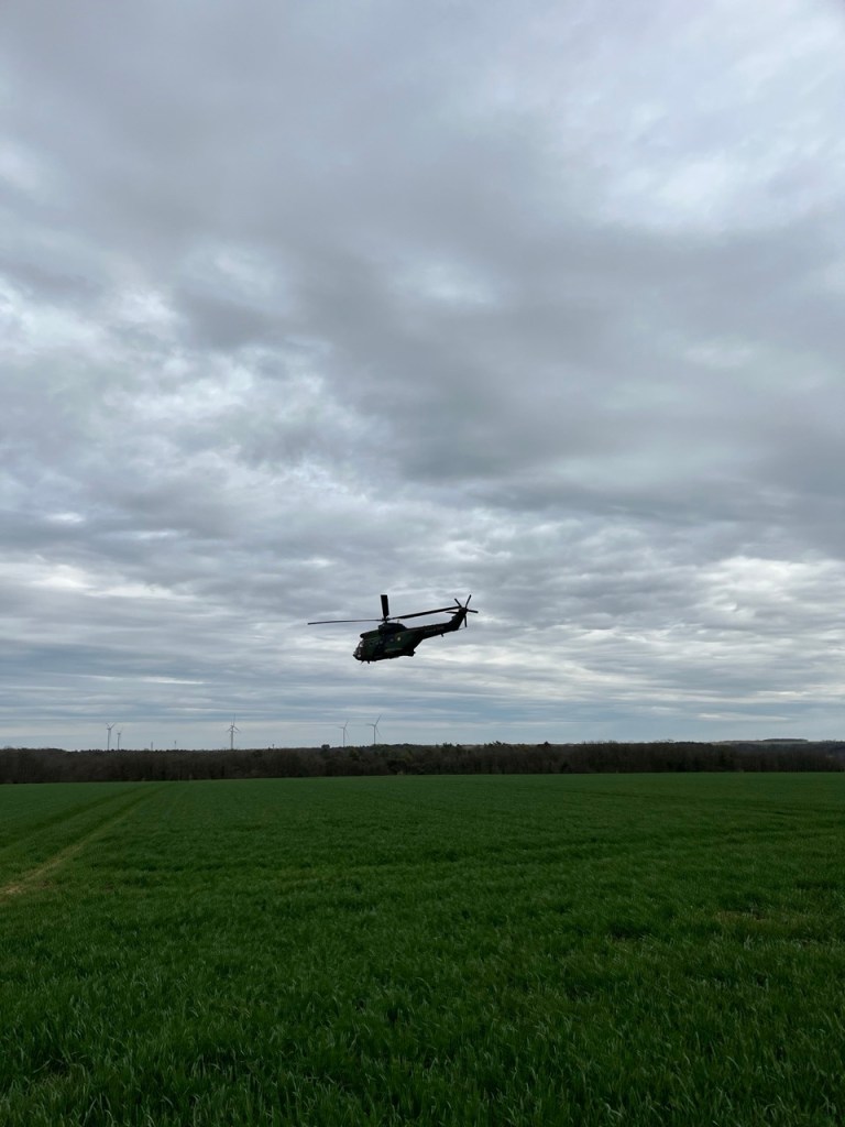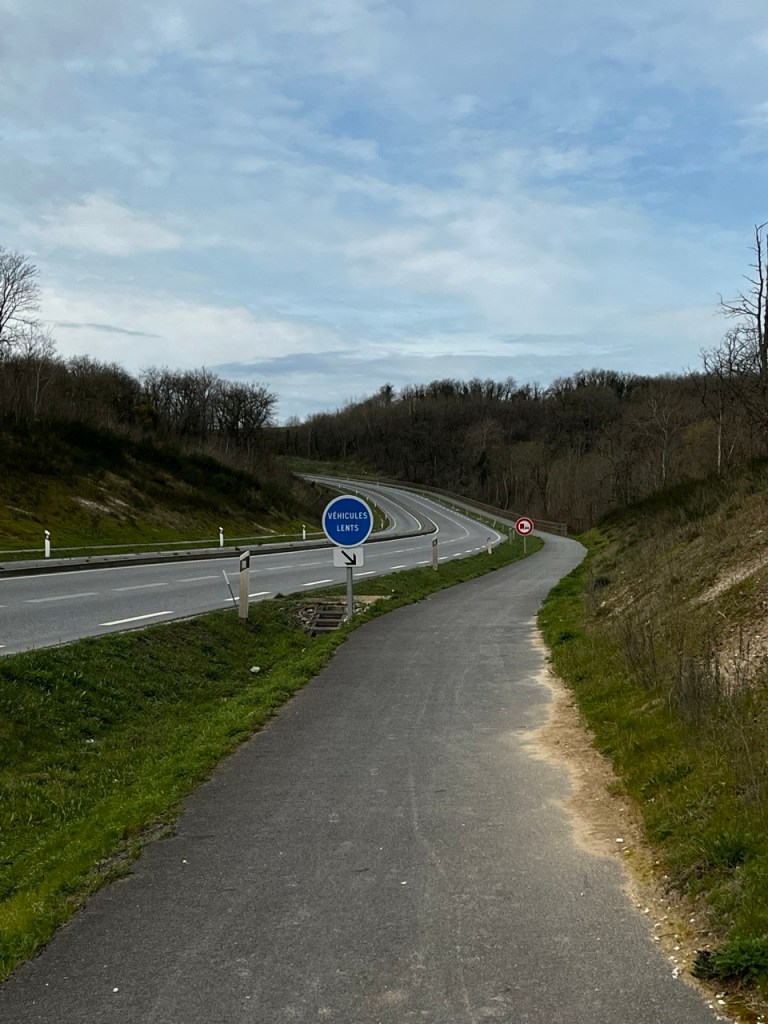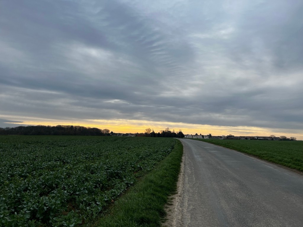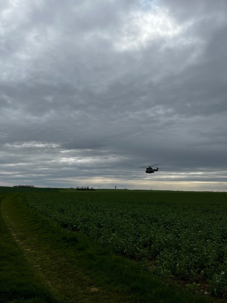 Je croise des voies rapides, ou l’on me fait comprendre que je suis lent … je suis toujours les marques de coquilles où qu’elles soient et le balisage est bien fait. A l’approche du repas vers midi trente j’ai effectué 16km, mi parcours dans Etampes. Le ciel est toujours aussi bas en reprenant le chemin, à 14h30 je suis aux 2/3 la carte fait plaisir à voir. Sur ce en pleine plaine un hélico militaire fait un passage bas à la « Apocalypse now » , il est à moins de 30m du sol … ils m’ont sûrement repéré de loin sur cette plaine rase avec mes couleurs de caméléon !!