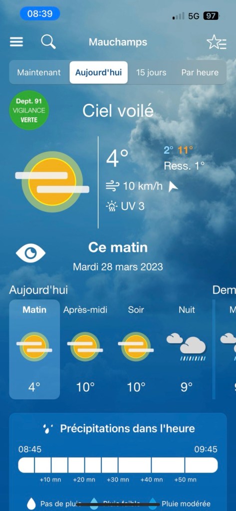 Arrivé à Saclas, d’autres ont eu plus de mal semble t il, et je pense que c’est le patelin qui a inspiré « les bidochons » au vu des rues portant ce patronyme. Finalement les 30km sont couverts en 7h23, soit une moyenne de 4.1km/h : top mais je vais éviter de recommencer tout de suite … et le gîte m’attend avec un réconfort bien mérité prélevé à la boulangerie en arrivant.