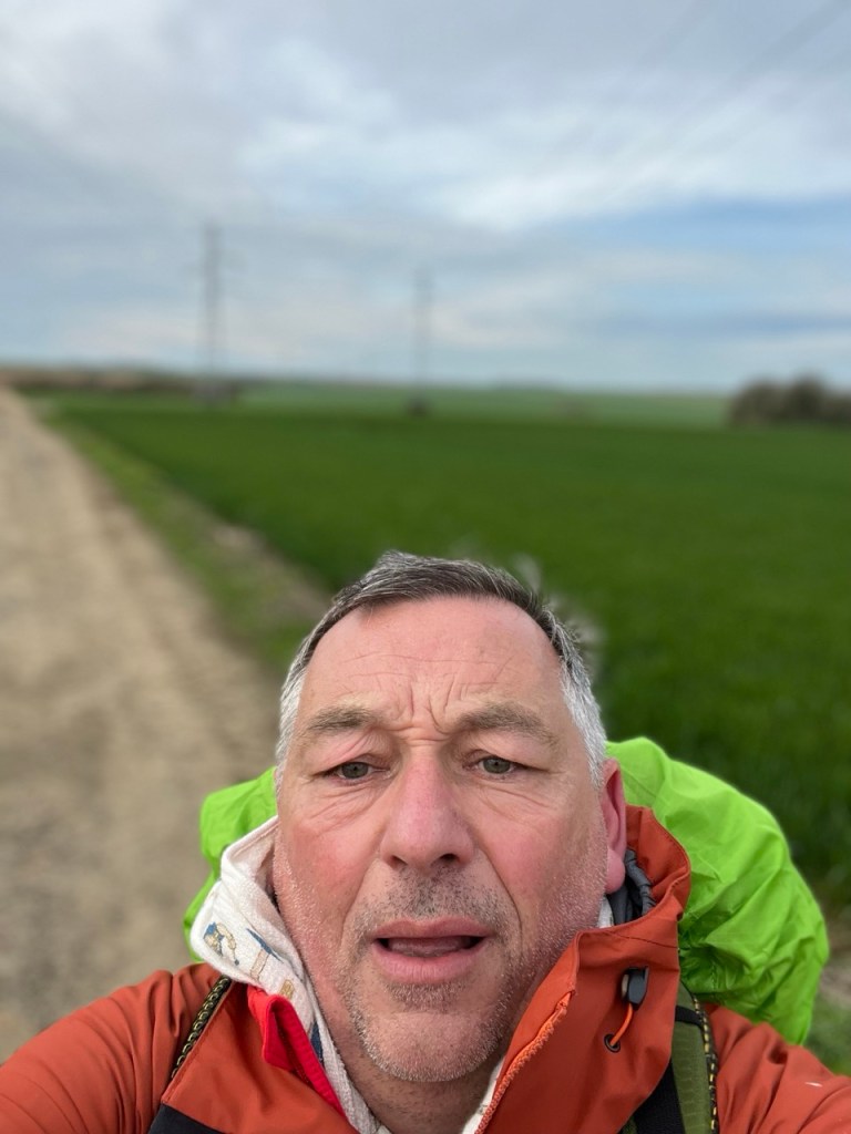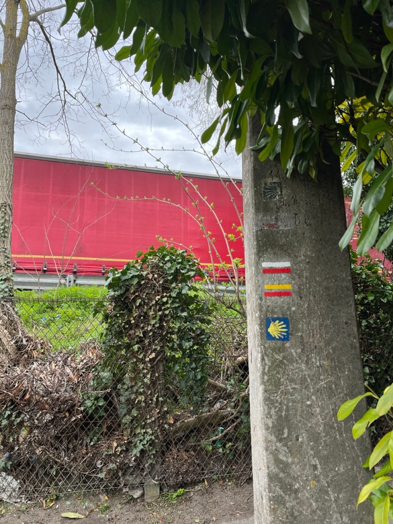 Le soleil finit par poindre le bout d’un rayon mais toute la journée restera grise et sans pluie sauf 3 gouttes dans la dernière demi heure. Au bout de 2h45 j’ai parcouru 1/3 de la distance c’est dans le tempo mais je dirais qu’à ce rythme je vais souffrir des pieds au bout de 20km : ni ampoule ou autre frottement sur la peau, douleurs internes que j’estompe le soir après moult massages. Ma route croise celle d’un autre marcheur aperçu au loin. Il me rattrapera quelques km plus loin et la discussion s’engage. Il se prépare pour un Porto-St Jacques, 270km, en groupe avec des amis d’ici 2 semaines. Il a fait la voie du Puy l’an passé nous avons pu partager ses expériences et recommandations. Au bout de 3 à 4km nos routes se séparent il tourne autour de son village.