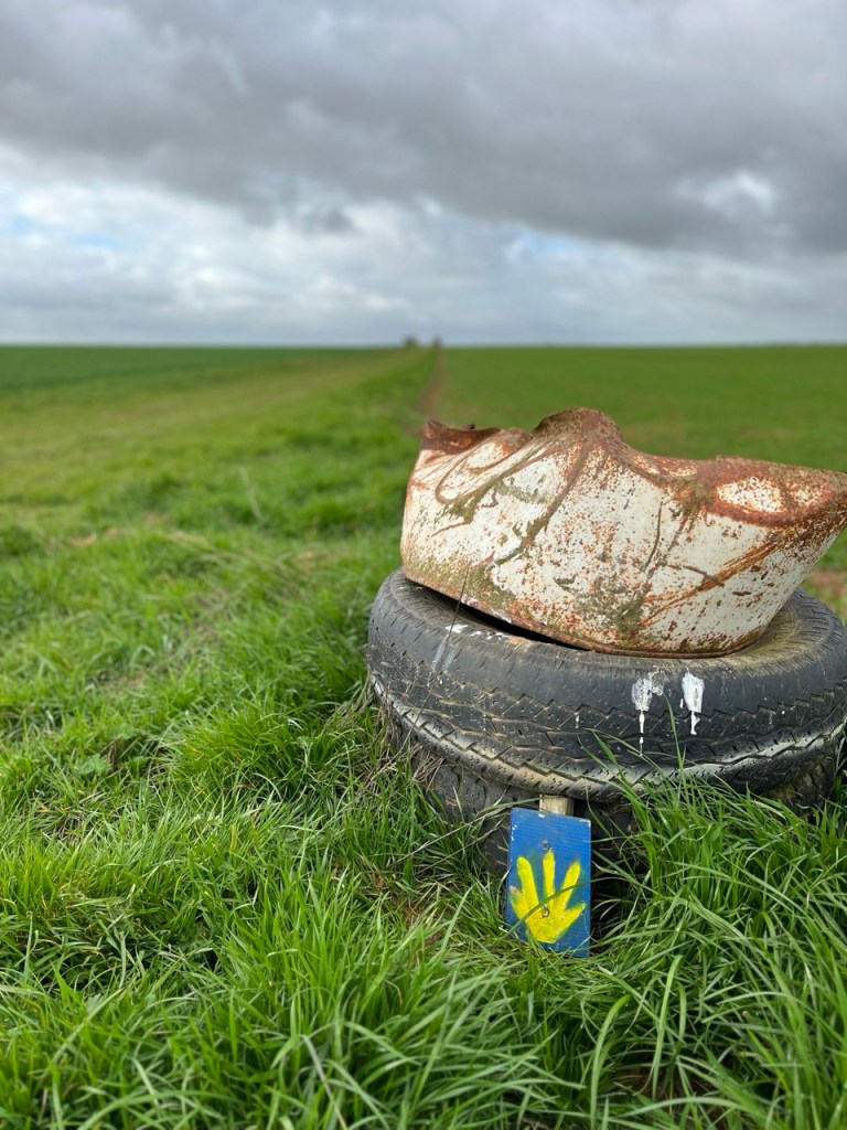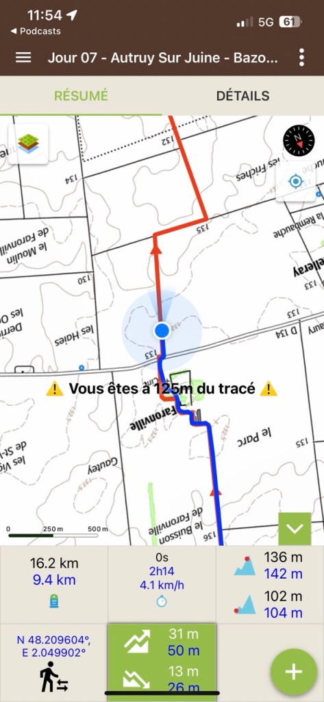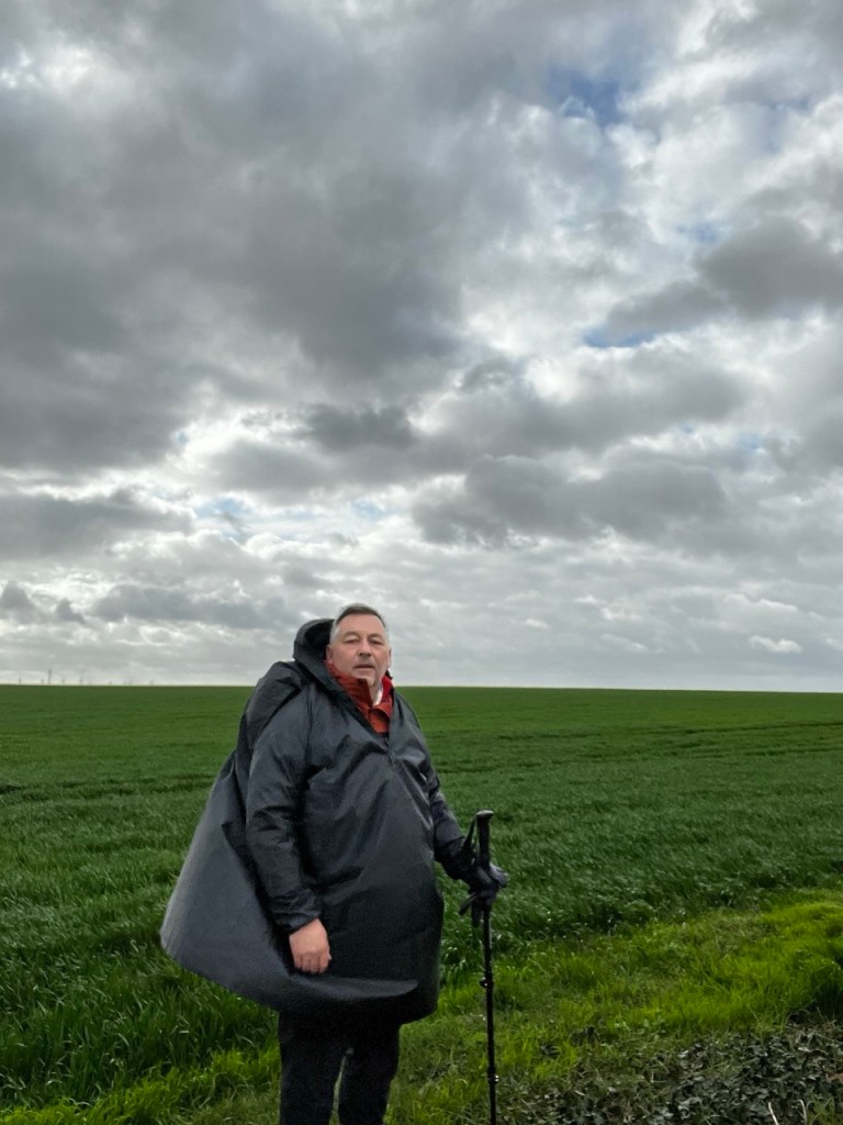 La progression est fatigante j’ai l’impression de faire du bateau. Quelques gouttes de pluie me font enfiler la cape par précaution. Non je ne suis pas en gestation de quelque chose, c’est le vent qui gonfle le cape !! On m’a aussi dit de cesser de manger des carambards en marchant mais ce n’est pas le cas !! Par moment le chemin « disparaît » dans un champ, peut être a-t-il été labouré … du coup je marche dans les traces de routes du tracteur.
