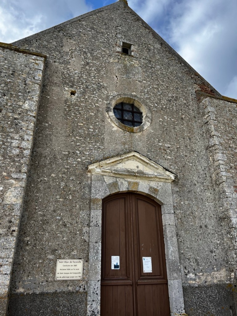 Je croise un lieu dit entre les deux villages de mon etape, grosse ferme, petite église et la marque du chemin de compostelle sur celle ci.