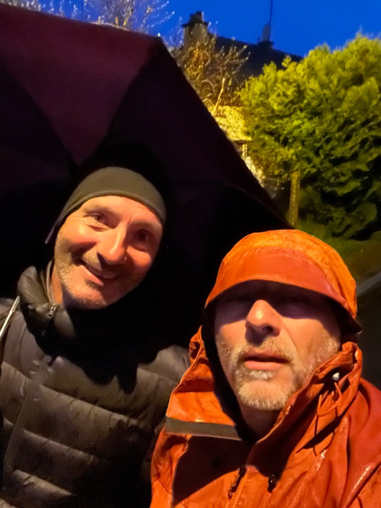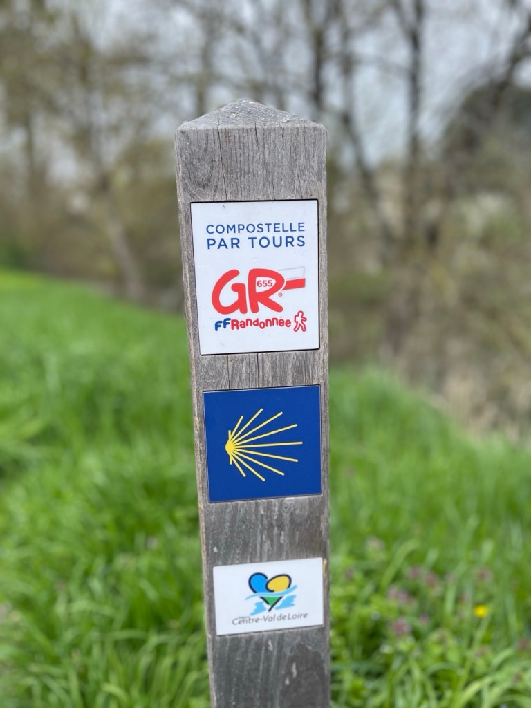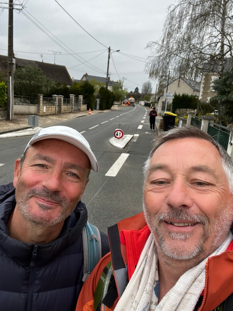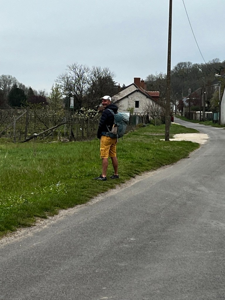 Ouch.…. déjà 14 jours de marche, deux semaines, et une passée en compagnie de Sébastien qui m’accompagne. En regardant la carte j’évalue mieux la dimension de ce trajet, 267km, et je ne suis pas mécontent. Au départ la petite photo traditionnelle nous voit bien sourire, même si le ciel est un peu chargé ce matin. Bientôt Pâques, au détour d’un pont en sortant de Blois nous dérangeons une cane qui couvait son oeuf, elle reviendra juste après notre passage.