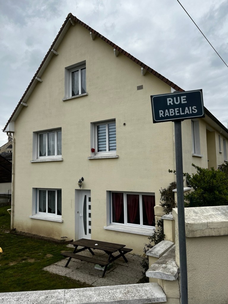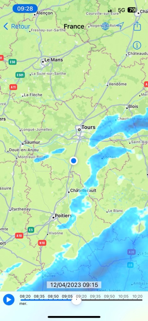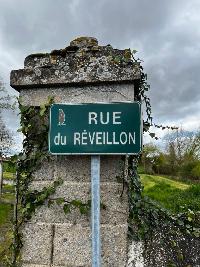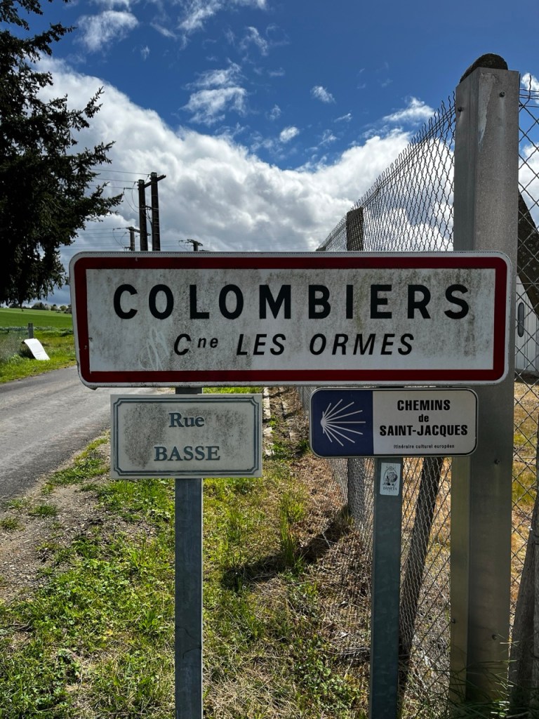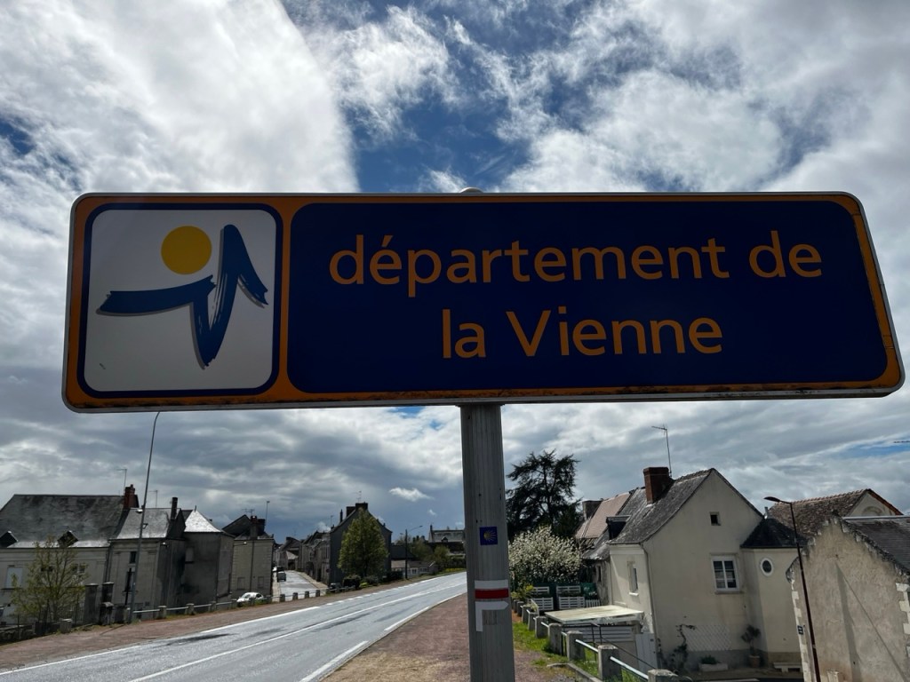 Je ne fais pas la tête en sortant à cause de cela mais plutôt à la vue du ciel !! Hier soir le gîte était occupé par 2 autres marcheurs, Florence 71 ans orthophoniste à la retraite, Éric 62 ans retraité aussi. Florence a déjà 2 camino a son actif , Éric est novice comme moi et en plus il a un petit sac (mal au dos) et une espèce de cariole qu’il a bricolé, dont un axe de roue s’est dessoudé. Il a trouvé une petite entreprise de Sainte Maure qui lui solutionné cela par une soudure à l’arc. L’occasion d’échanger durant la soirée les expériences et sensations. Première nuit en mode «dortoir » mais la fatigue l’a emporté, et pas de ronfleurs sauvages. Ou alors nous avons été super polis !! 😂😂 Florence lève le camp à 8h suis des trombes d’eau, elle est en sandales et chaussettes … ça va être humide pour elle ! Eric suis 30mn plus tard dans les quasi mêmes conditions. Moi je m’entête sur le blog, sans succès et à 9h je suis dehors avec cette grimace ! D’ailleurs je note que le gîte est sis Rue Rabelais, même nom de rue que chez moi.