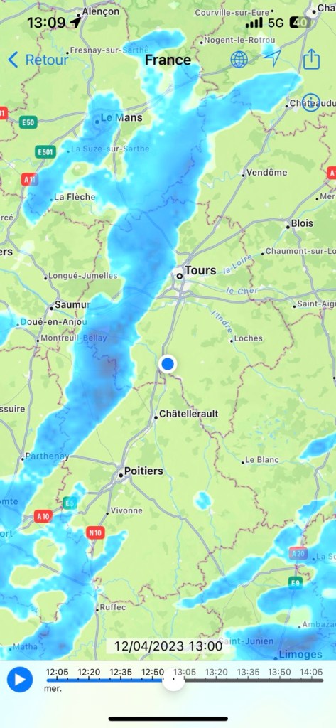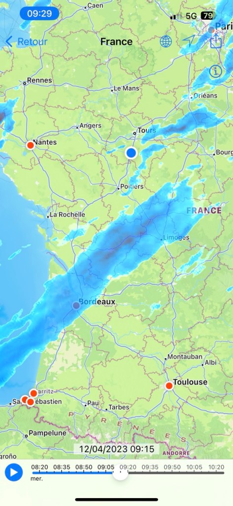 Ce qui me guette selon Raintoday n’est pas encourageant non plus. Les nuages à la sortie de la ville sont bien bas et noir, mais le vent souffle !!!