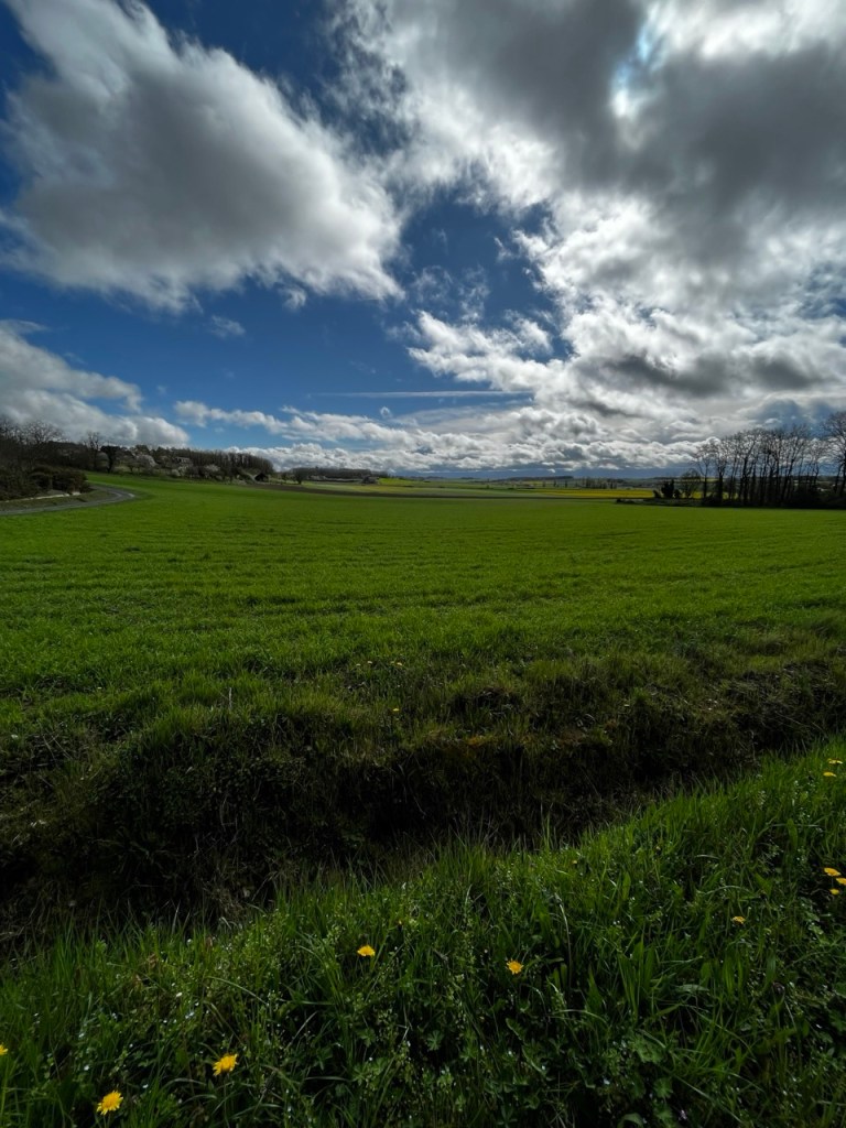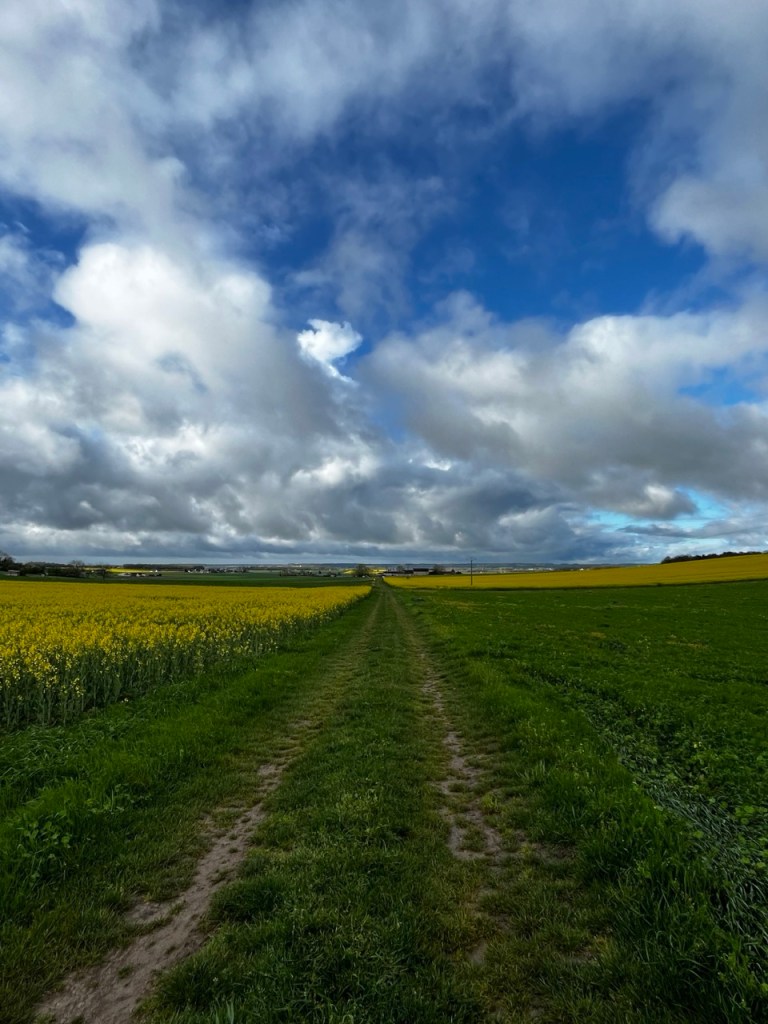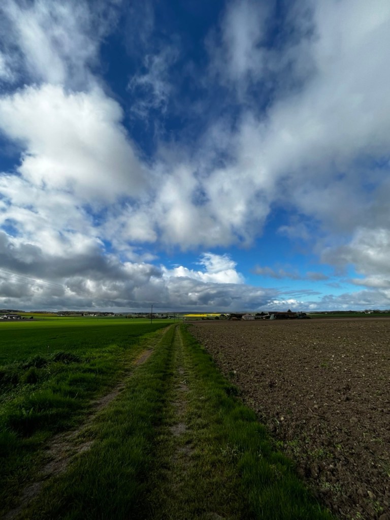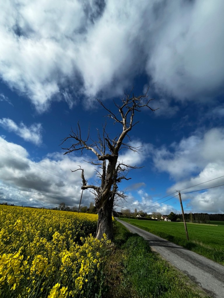 Je croise les empreintes de Eric qui a du passer avant moi, les marques de roues de sa carriole sont bien visibles. Le temps offre des contrastes de couleur superbes et je ne me lasse pas de m’arrêter prendre des images des colza, des blés, des arbres sur ce fond de ciel bleu et blanc.