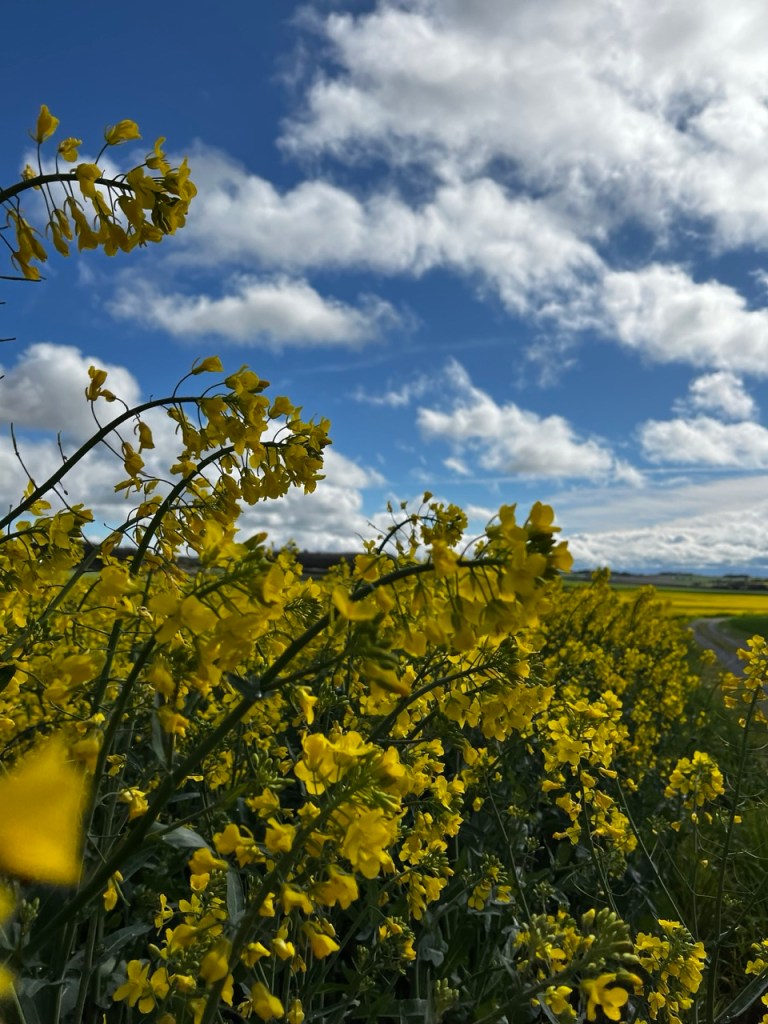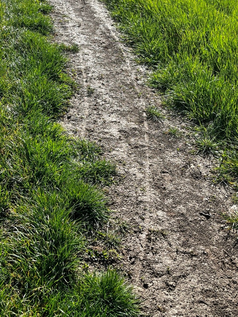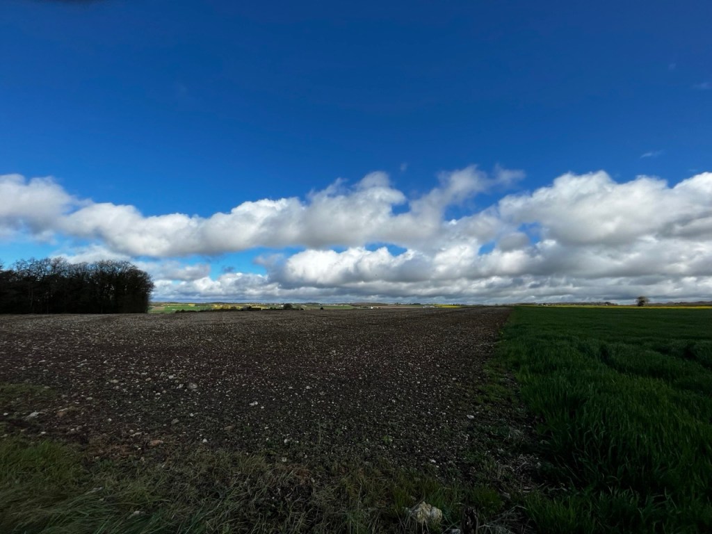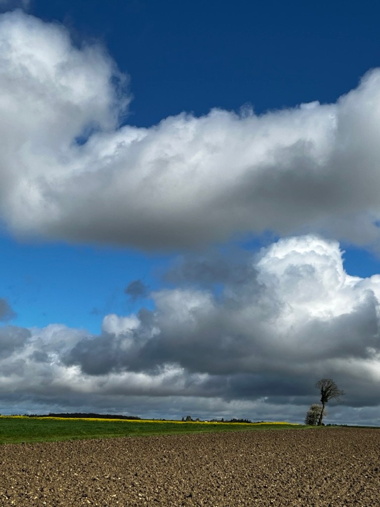 Je croise les empreintes de Eric qui a du passer avant moi, les marques de roues de sa carriole sont bien visibles. Le temps offre des contrastes de couleur superbes et je ne me lasse pas de m’arrêter prendre des images des colza, des blés, des arbres sur ce fond de ciel bleu et blanc.