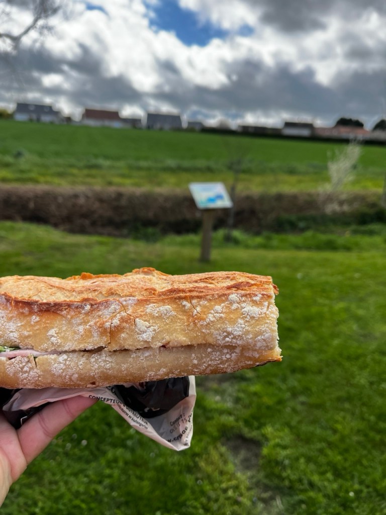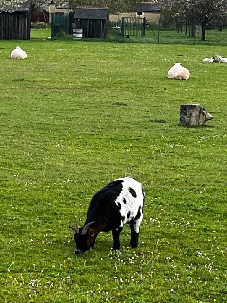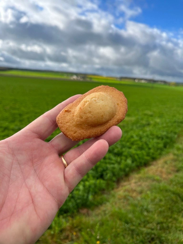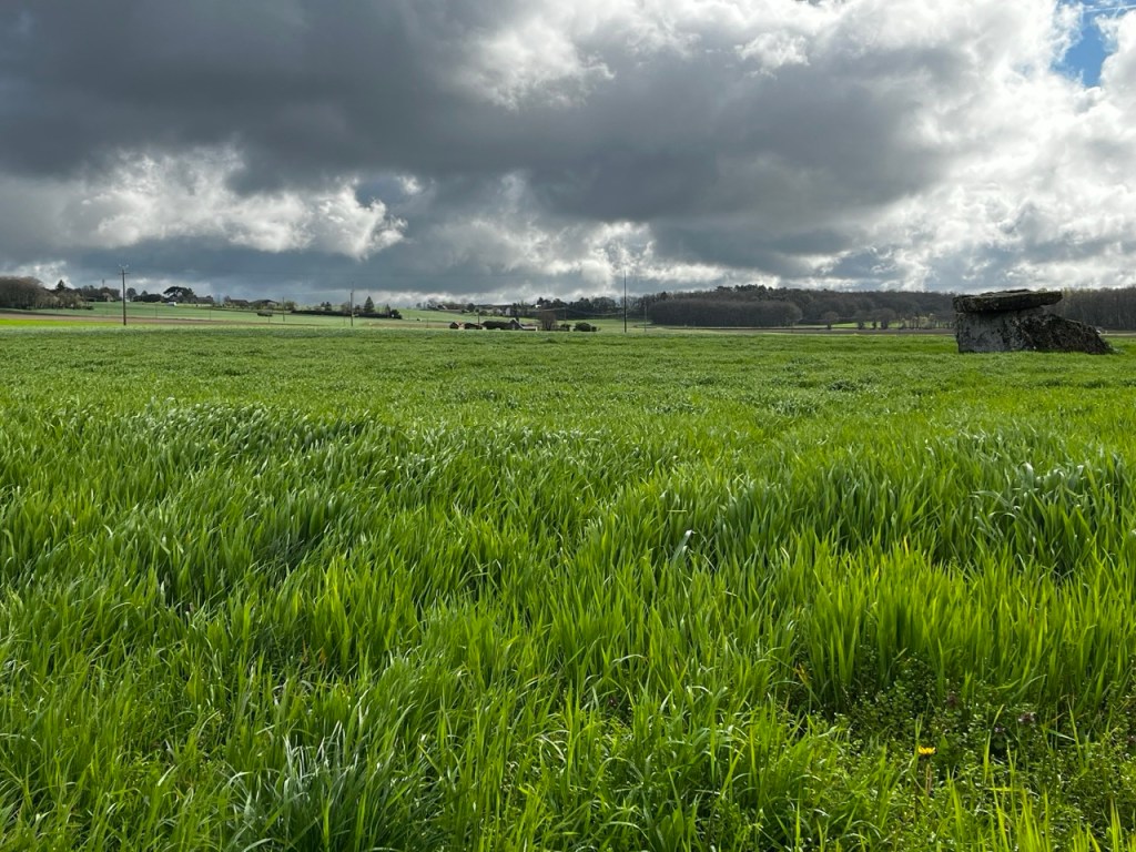La matinée se passe super bien : soleil, pas de pluie, le vent souffle. Je croise des biquettes, un dolmen du neolithic qui devait de sépulture commune, des champs de blés bien verts qui ondulent fortement … et quelques madeleines « coquille » en guise d’en-cas.