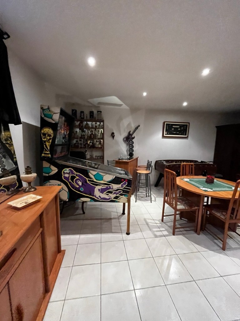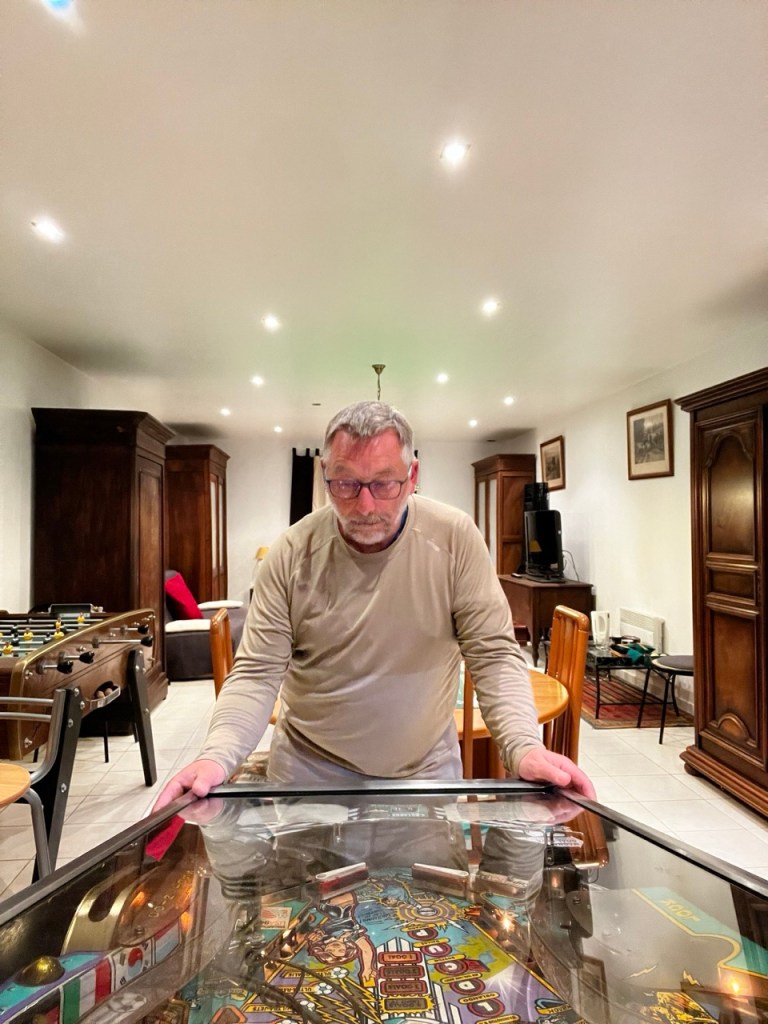 Au détour d’un panneau indicateur je découvre que le stick de protection des lèvres a pu être fabriqué à quelques hectomètres de là … le hasard … La destination finale se profile, et juste avant je suis interpellé par ce monument avec une croix métallique et le christ encadré de deux poteaux électriques bien menaçants, une image très décalée. Bon enfin posé dans le gîte, bonne distance, bon rythme aussi. Celui offre tout le confort, une fois la douche et la lessive faites, j’ai redécouvert les jours du flipper, un d’époque années 80-85, avec des bumpers et pas trop d’électronique, super !!