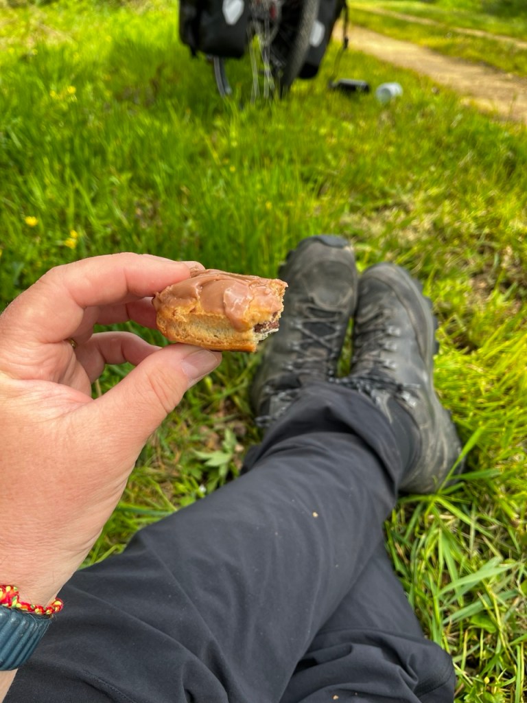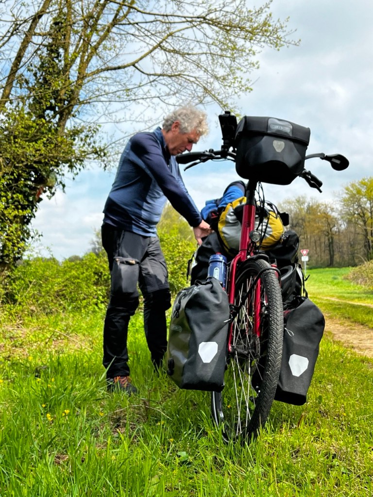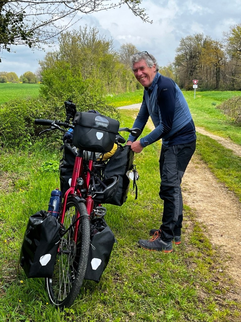 A la sortie de Lusignan premier panneau indiquant la direction de Saintes, étape importante de dimanche prochain car je m’y arrêterai pour rejoindre « Papa » et « Maman » pour 2/3 jours à Royan. Je crois que « Maman » est impatiente, n’est ce pas maman ? 😉 Un peu plus loin je me suis fais rejoindre par Gisberg (Gilbert je crois en hollandais) qui est parti de Hollande pour Compostelle aussi mais à vélo. Il a tout le nécessaire pour camper, cuisiner, autonomie totale, mais un sacré bardât à trimbaler. Nous discutons et avançons 2-3 km ainsi puis nous posons nos sacs dans un chemin pour la pause déjeuner. Il m’offre un café et pain chocolat, je lui propose un demi éclair au chocolat en dessert !