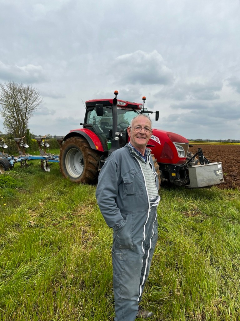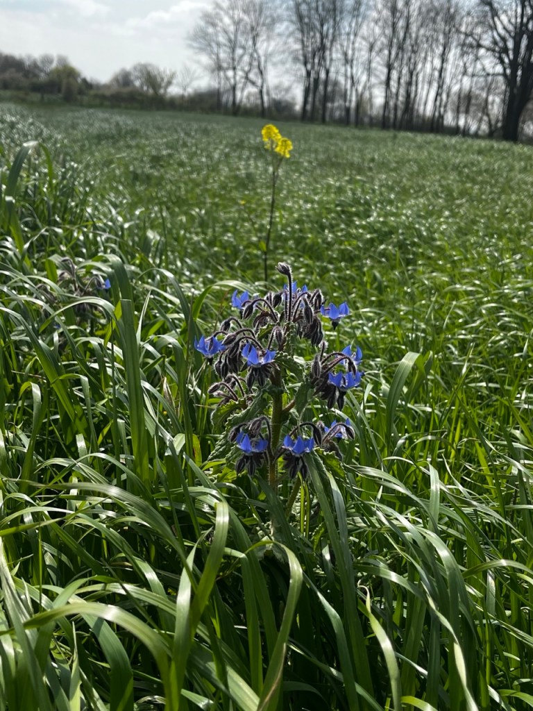 Un compagnon de repas reste sur place quand nous partons, un magnifique scarabée bleu, en tout cas ce que crois être un scarabée. Encore des colzas … on ne devrait pas manquer d’huile l’hiver prochain, ou bien je n’y connais pas grand chose !!! Les chemins herbeux comme celui-ci juste coupés sont un plaisir pour la marche : de la moquette … mais cela ne dure pas non plus. Un agriculteur prépare sa terre, labours en cours, il s’arrête fait demi tour et descend discuter. Jean-Marie prépare du tournesol, et on se rend compte qu’il connaît Esther et Jean-Louis chez qui je me rend ce soir, ses voisins avec qui il a pris le café le matin même : rencontre extra !