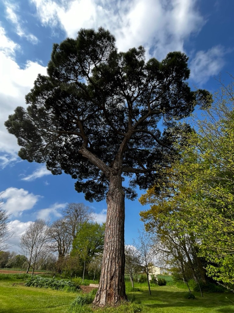 Le rythme est bon durant la matinée, je me surprend dans un miroir d’un virage pour les voitures. Petit ruisseau , belle demeure ponctuent une langueur qui monte progressivement. Je suis un moment sur un chemin nommé justement «chemin de St Jacques » : tout est ok !! Je prends en photo ce superbe pin peu avant de capter ce message de brassens gravé sur un panneau et qui tombe juste à pic.
