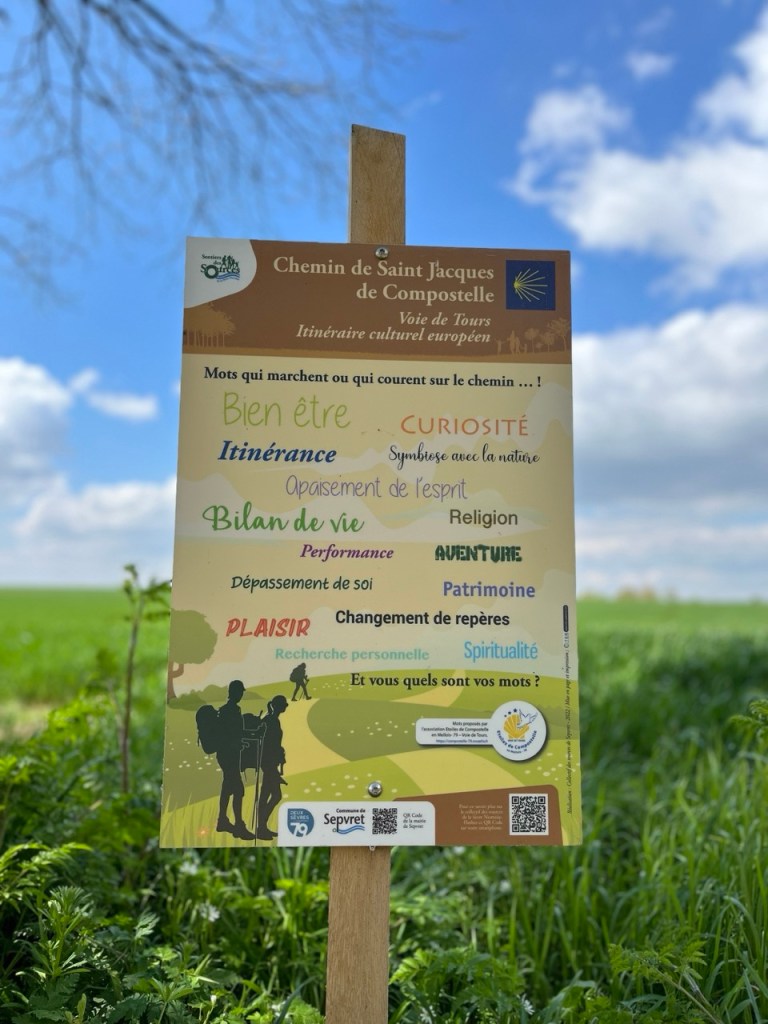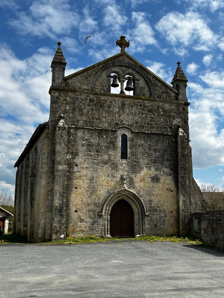 Finalement l’envie de la sieste est plus forte, je m’arrête pour 20mn après avoir lu ce panneau qui égrène les mots suggérés sur le chemin : j’y ajouterai bien « sieste » donc !! Finalement j’arrive à Melle, un peu en trainant les pieds, devant une église du XIeme dont la façade me fait penser que Clint Eastwood va sortir de derrière à cheval … allez demain c’est mercredi milieu de semaine, finalement hâte d’être à Saintes aussi dimanche prochain. Hypothèse pour ce coup de mou : pas de pause café dans la matinée, où absence de dessert au déjeuner … allez savoir ??