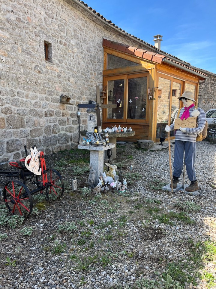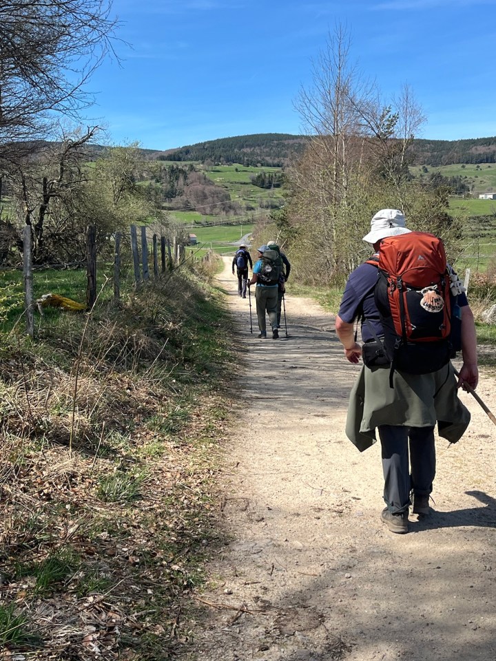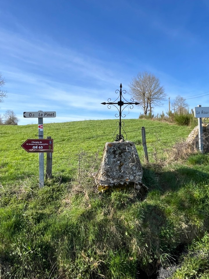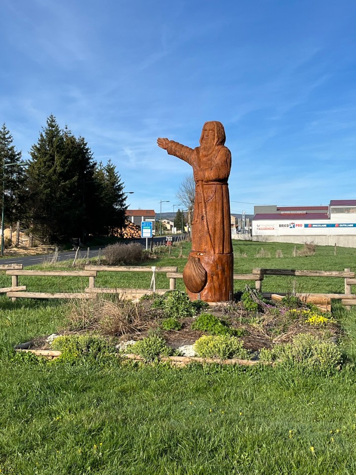 Je quitte Saugues sous un beau soleil dès le matin et la bénédiction d’un St Jacques en bois. La petite rosée du matin donne un peu de fraîcheur … ça ne va pas durer. De jolis paysages attendent encore qu’on les capture sur nos écrans.