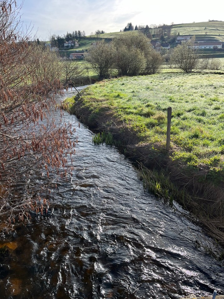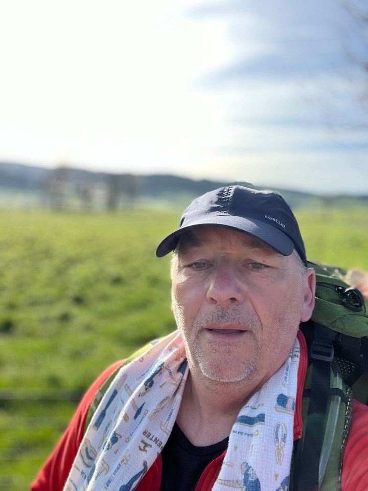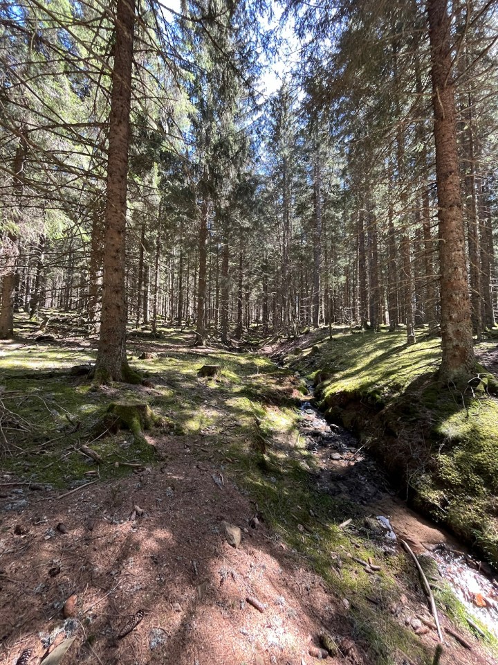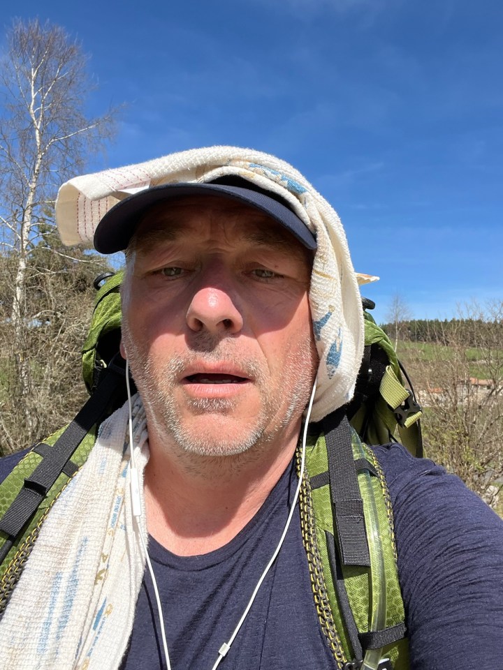 Alternance de petits hameaux de 2/3 maisons, champs et prairies, bois de résineux, et surtout des montées régulièrement et plus pentues les unes que les autres. Le soleil est de plus en plus chaud, crème obligatoire sur les avant bras, le visage et l’oreille gauche exposée à l’est toute la matinée.