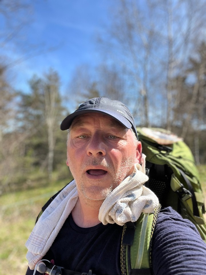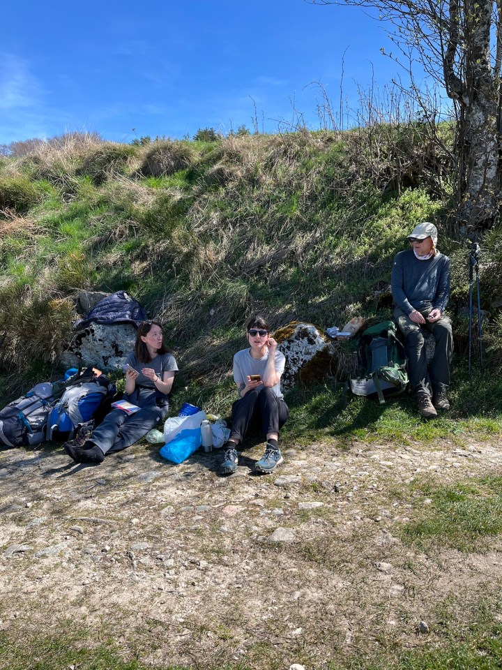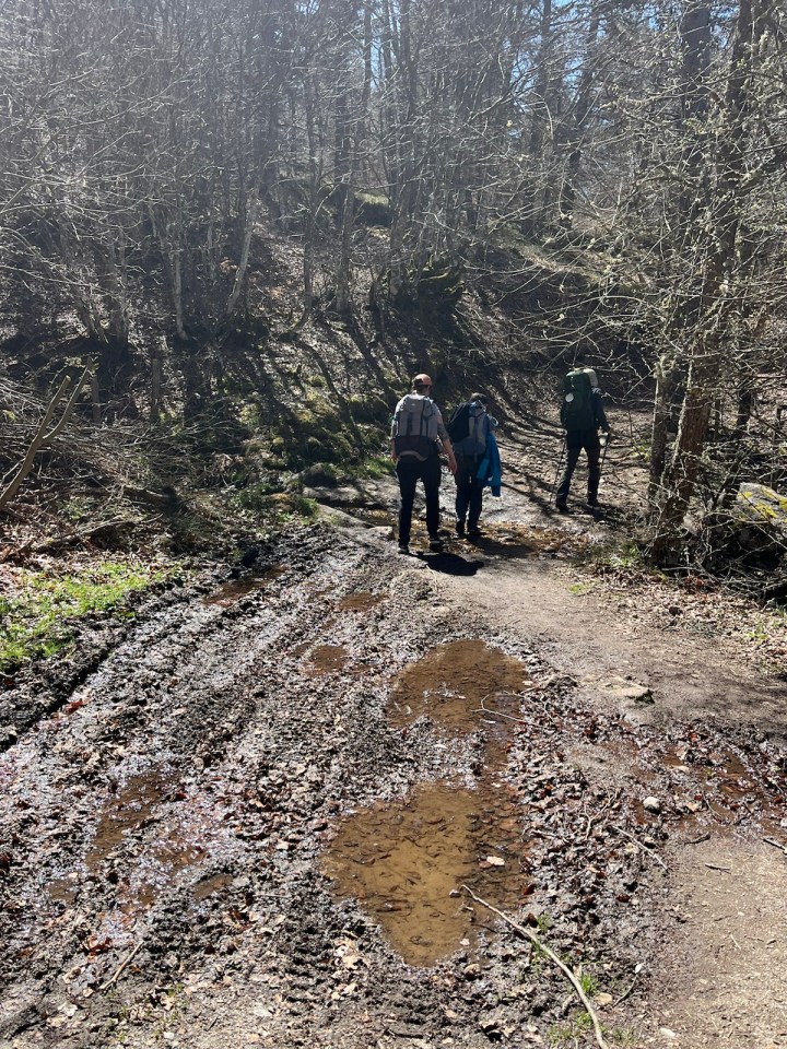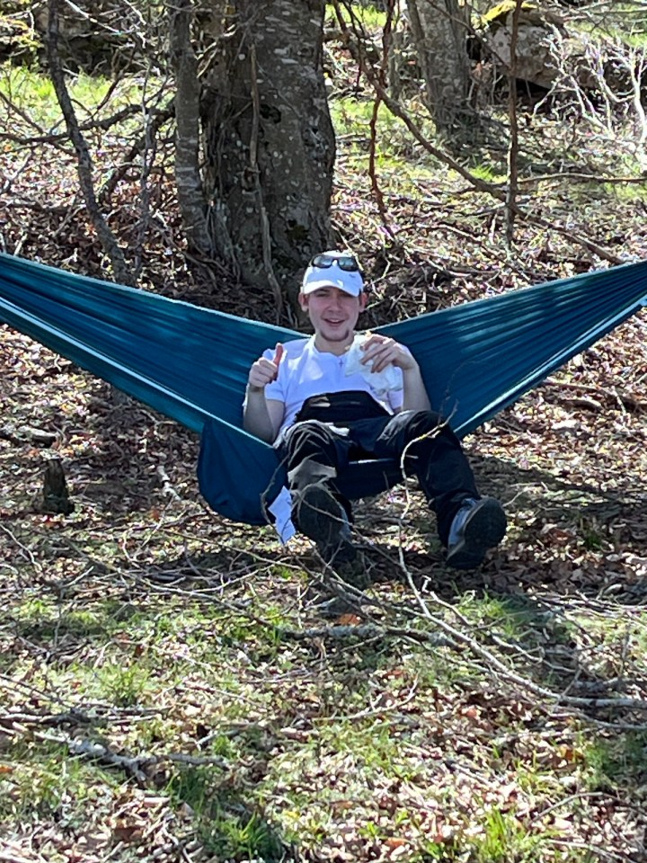 Je repars, il fait de plus en plus chaud, obligé de me couvrir la tête et l’oreille droite pour éviter le coup de chaud et de soleil. Mon litre et demi d’eau y est passé et j’ai rechargé la poche quelques temps avant déjà. je rattrape une partie de la troupe, je suis lent le matin sur 3km histoire d’être chaud après c’est mieux … et je croise Evan qui a tendu son hamac pour la pause sieste ! Un peu plus loin jonction avec le groupe Thierry, Clara et Rosalie. Nous finirons l’étape ensemble et ce qui vient va être difficile car ça grimpe sec. Il est 13h encore 2h de marche pour atteindre le gîte Le Sauvage.
