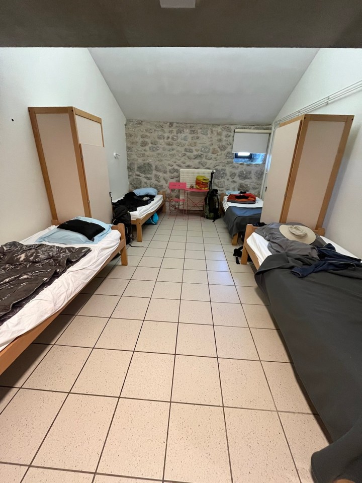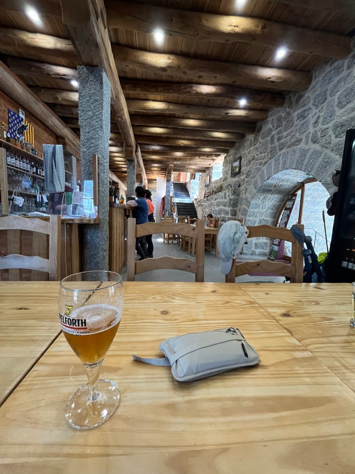 Le gîte est très spacieux, 40 lits, tout est plein beaucoup de marcheurs n’ont pu réserver et se voient contraints de rejoindre le prochain village à 3km. Endroit calme il n’y a rien d’autre que cette bâtisse. C’est sobre mais confortable, chambres de 4 lits. La biére est bien méritée pour récupérer avant d’aller se doucher et faire la petite lessive.