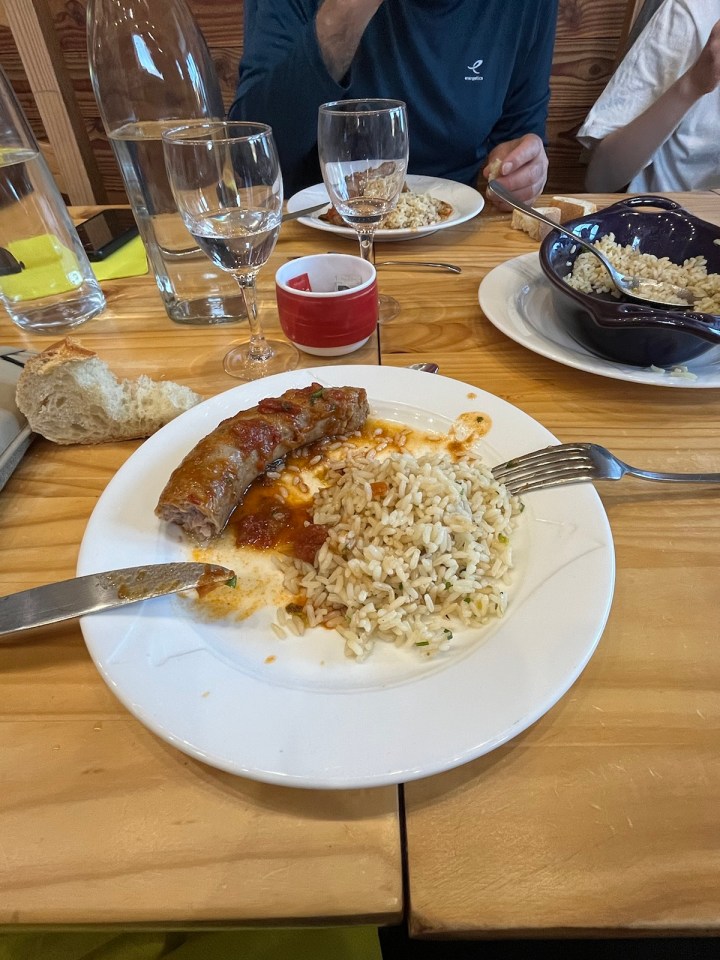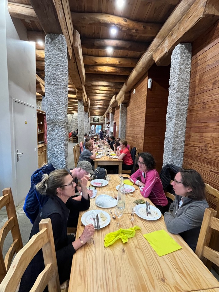 Le dîner est simple mais bon. J’ai découvert la gelée du diable, une gelée de gentiane en accompagnement des fromages proposés. Service à table pour les 40 marcheurs, ça dépote !