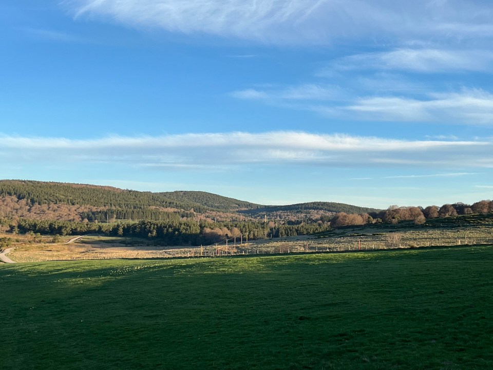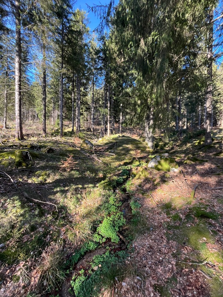 Le chemin sinue entre bois de résineux et plateau bordé de champs. J’aime ces quelques arbres tortueux seuls le long du chemin.