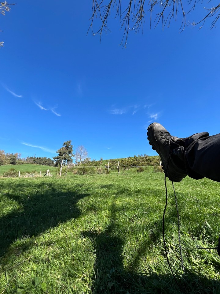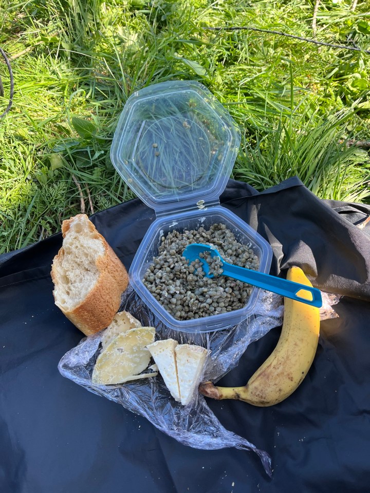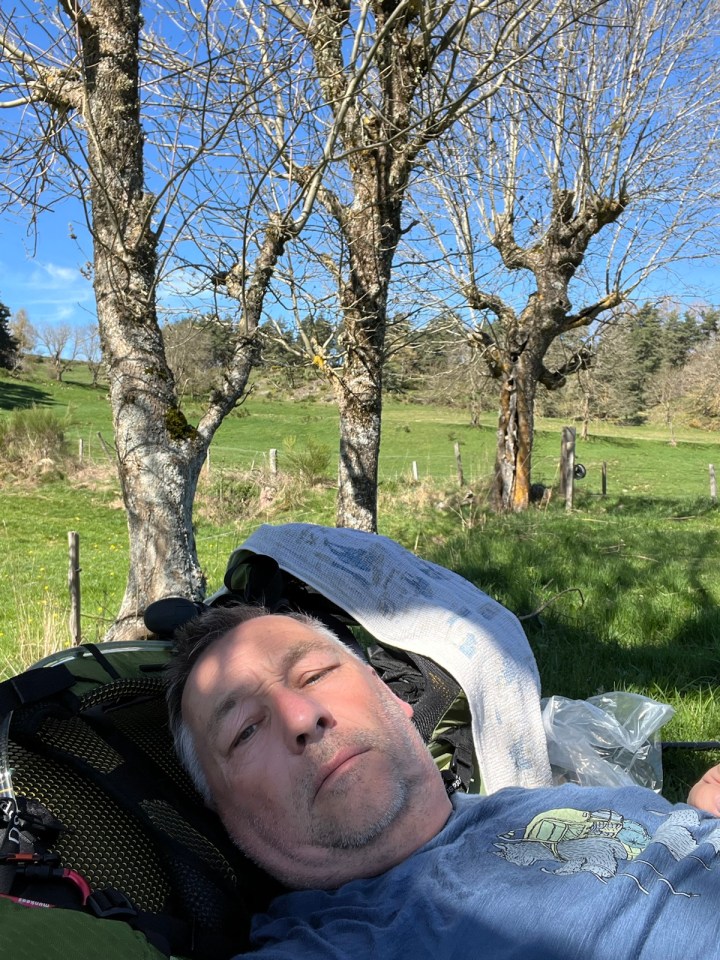 Après avoir croisé un tracteur, qui transportait un petit chien dans un baril découpé pour lui afin de rester avec son maitre sur le véhicule, je repère un bout de champs à l’herbe grasse à l’ombre de quelques arbres, et où coule un petit ruisseau. L’endroit idéal pour m’arrêter, il est 11h15, et attendre au repos l’heure du dej. 30mn plus tard c’est l’heure du dej, bon les lentilles en sauce proposées au sauvage ne sont pas top, mais ça tient au corps. J’enchaîne avec la sieste de 20mn.