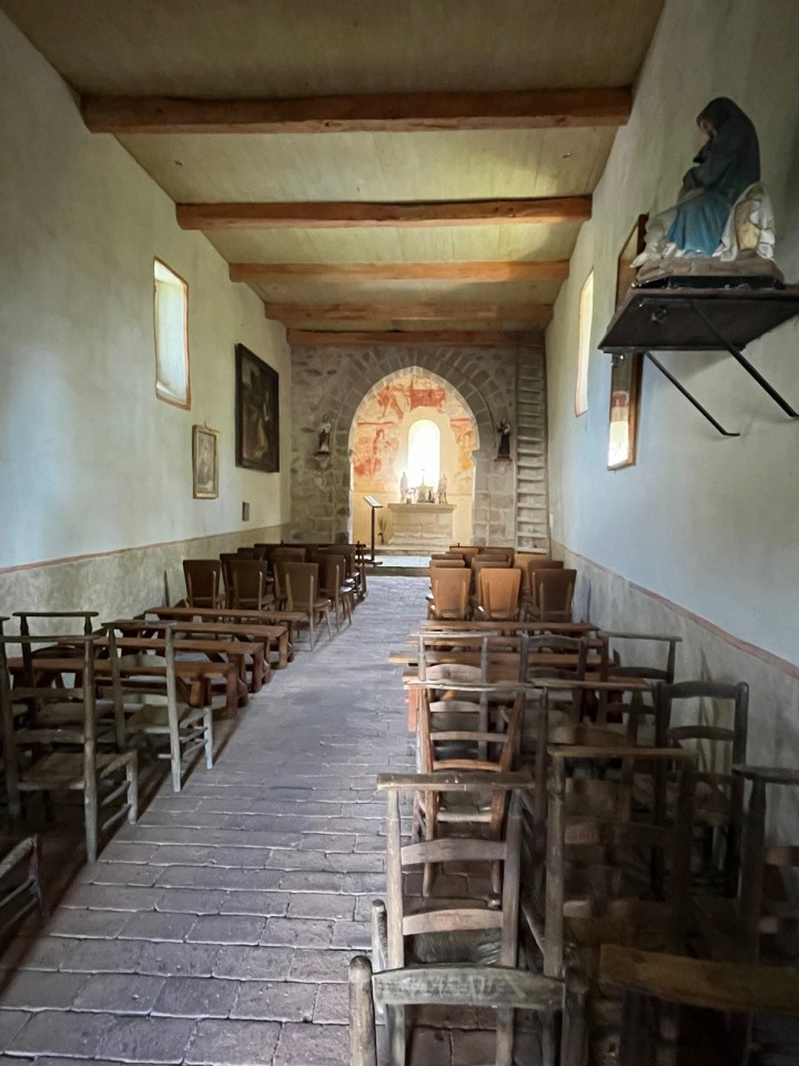 Peu après dans le hameau de Lacoste, la dernière famille exploitante fait passer son troupeau de vaches d’un près à l’autre. Ils ont repris les 10 fermes du coin, et restent seuls aussi survivants que la R5 … Petite chapelle de Guirande, vraiment petite.