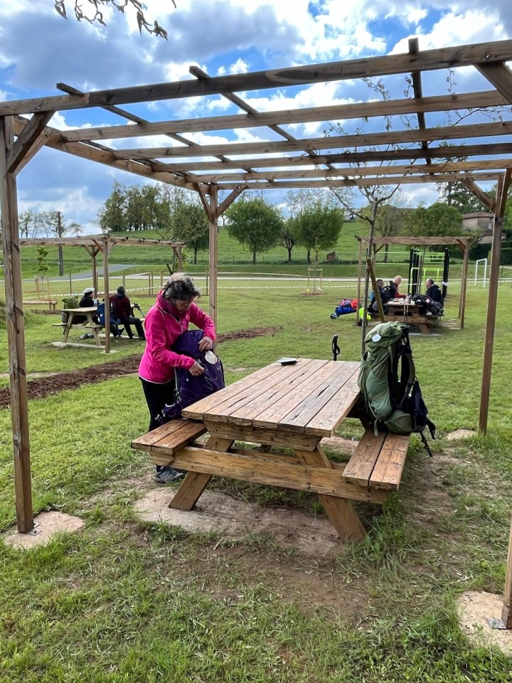 A Montredon café chez Hélène qui y tient un gîte. Astucieusement c’est le dernier lieu pour se ravitailler avant Figeac, 20km, il y a d’un du monde et une offre pour tous les goûts, y compris tee-shirts et bracelets souvenirs. Du coup ces dames qui ont été sevrées de « magasinage » en profitent 😄😄. Le gîte Lacoste me semble moins accueillant et je me dis que 800m en corde dans un puit … pas mon truc…😂