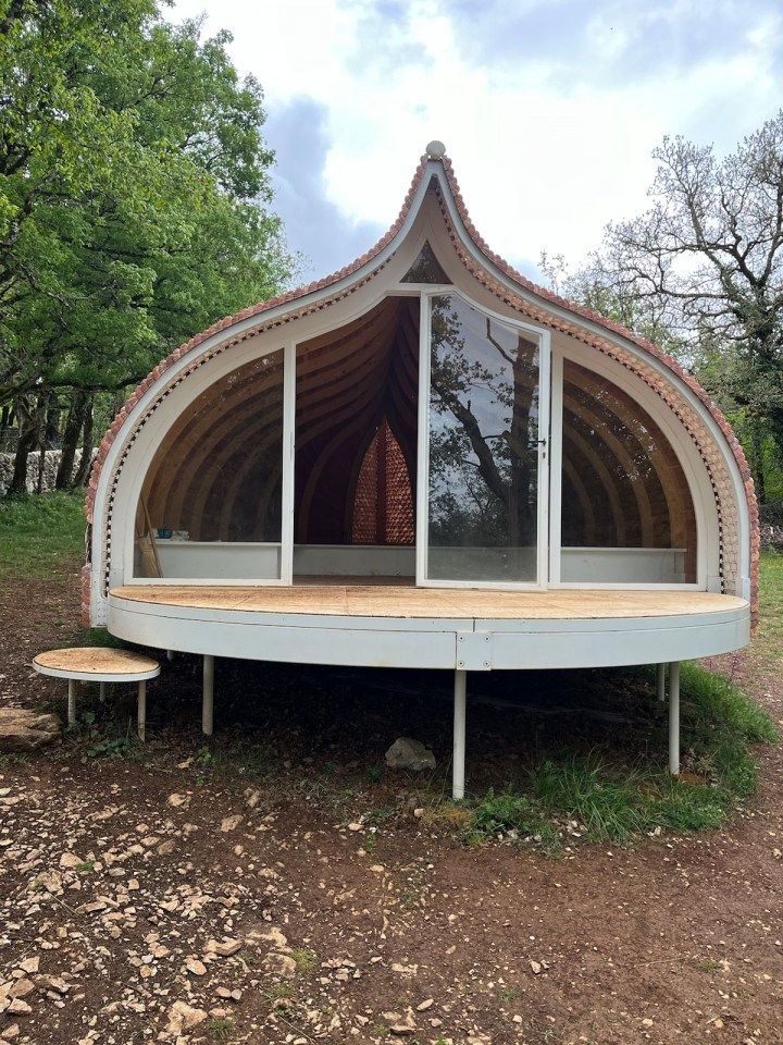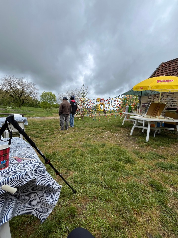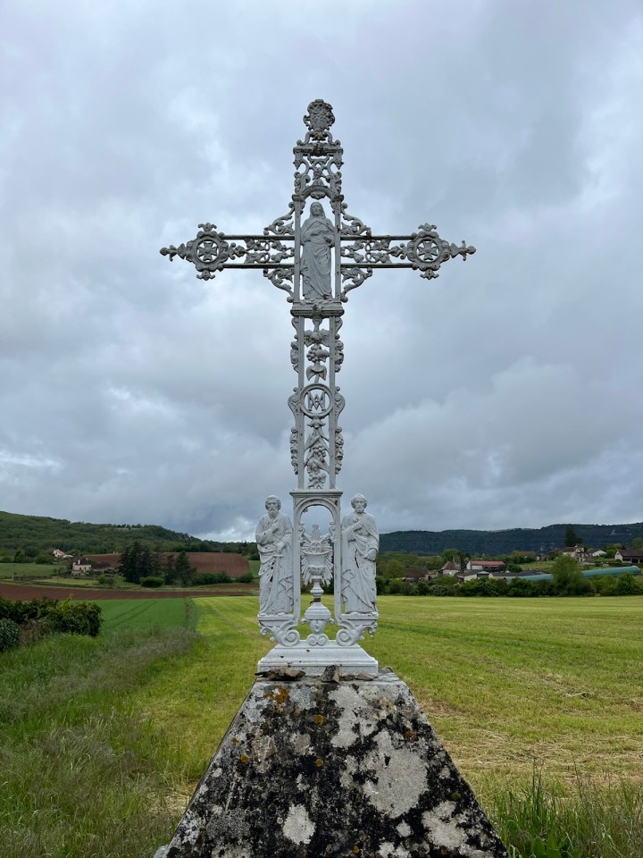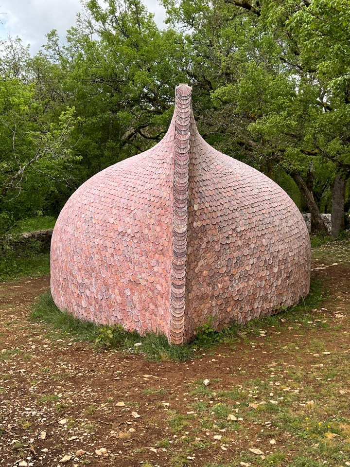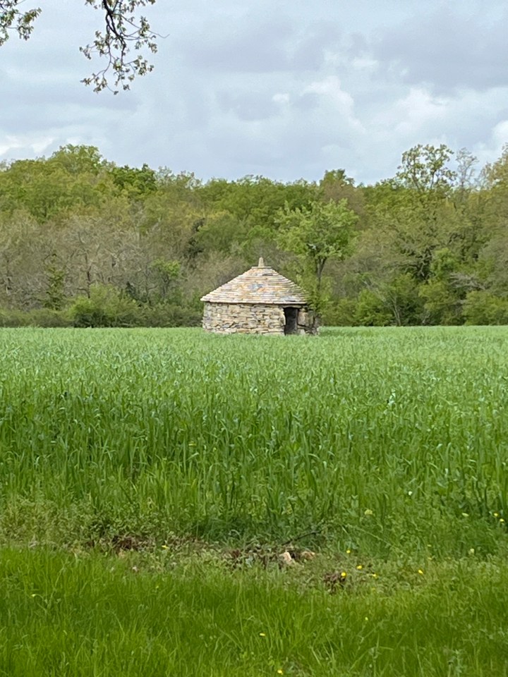 En approchant de Limognes-en-Quercy je vois cette construction, sorte de demi coque inversée recouverte de 8000 coquilles St Jacques. Un exercice d’une artiste architecte plasticienne : œuvre d’art «  refuge ». Puis passage à l’église du village et enfin je trouve le gîte de ce soir, « au bon marché », de Manu et Nathalie. Demain Vaylats et retrouvailles avec Thierry, nous partagerons nos histoires des derniers jours.
