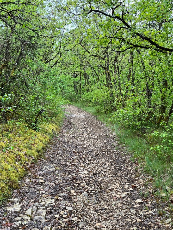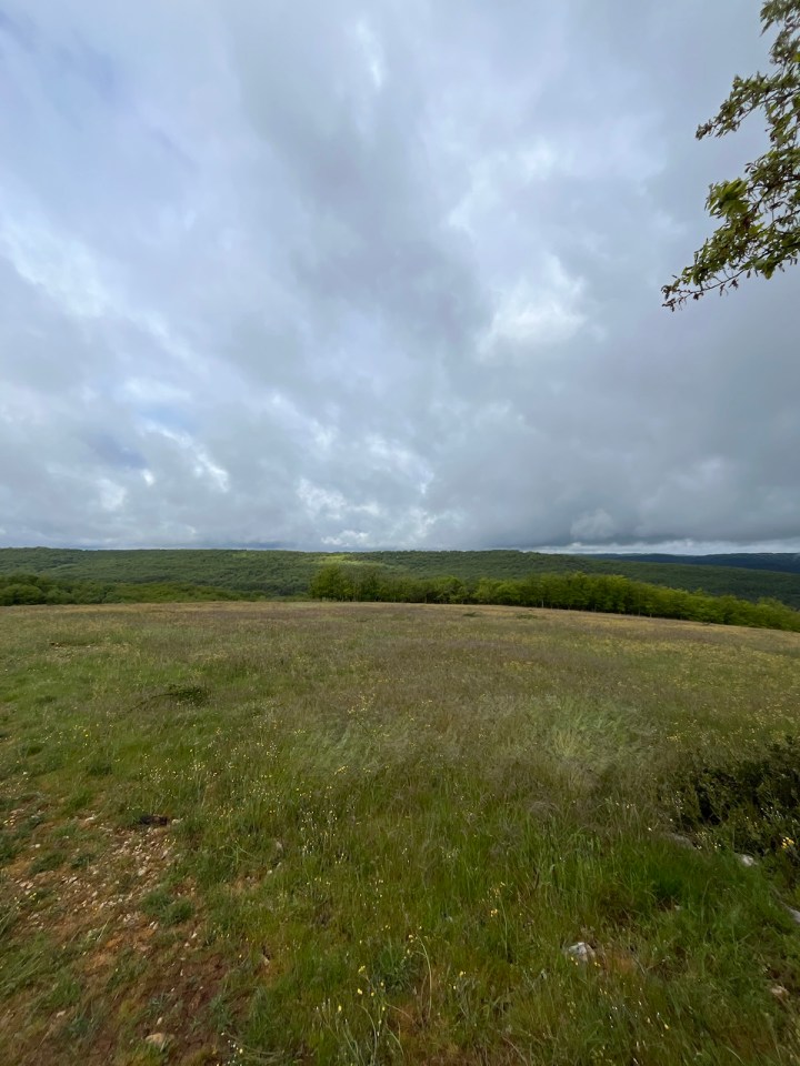 Le début était sur la route, jamais top le bitume. J’ai crains pour ma sécurité en passant à proximité d’un hamster de garde … puis rapidement j’ai rejoins une forêt de chênes, type chêne du Portugal, petits et trapus, si si … Et bien sûr c’était une montée sur 2km mais en pente douce. Au sommet de cette butte le temps était toujours menaçant.