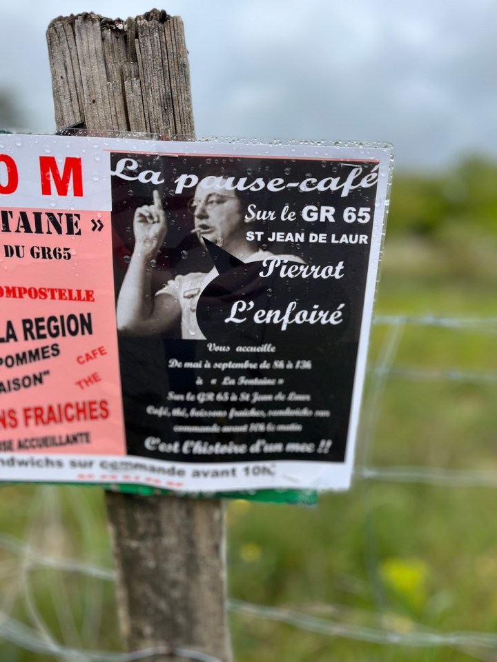 Encore du bitume puis de nouveau un bout de chemin, je croise un message annonçant une pause café. J’y trouve une paire de gars sympas avec Thermos et tarte aux pommes maison.