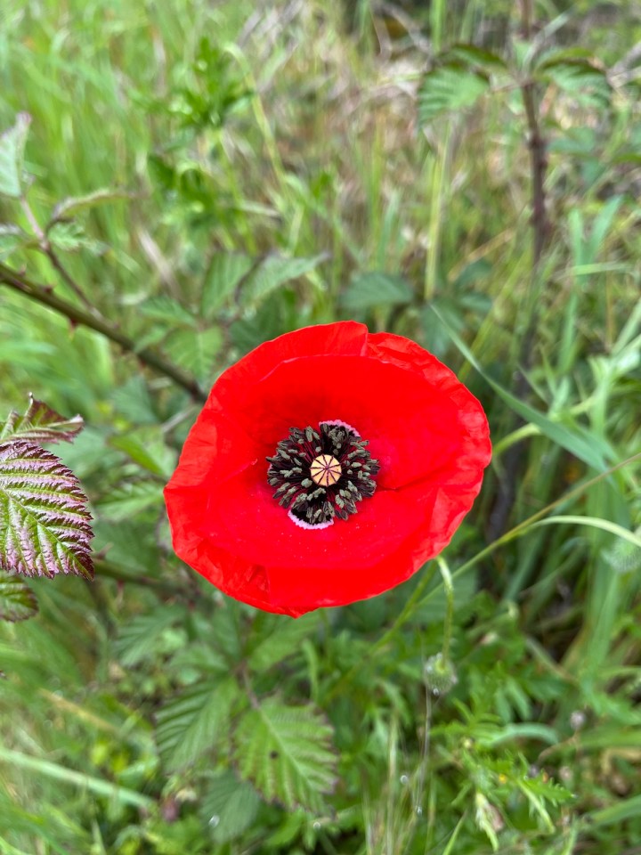 Les couleurs aujourd’hui varient du rouge éclatant du coquelicot au gris plus ou moins foncé du ciel qui tranche avec les mauves des fleurs et verts et jaunes des champs. Sur ce chemin un nombre impressionnant de personnes passent tous les ans et je crois que ce chiffre a plus que doublé depuis qu’il a été apposé sur ce panneau.