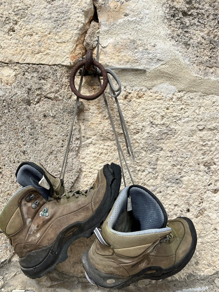 Concernant les chaussures qui sont exposées, je crois avoir une explication : elles sont comme des ex-voto signalant le bon chemin car les pèlerins ayant des ampoules les enlèvent et éclairent la route pour les suivants eh. Aujourd’hui, dimanche, pour nous ce sera entrecôte frites arrosé avec un merlot de Talmont, et pour toi?