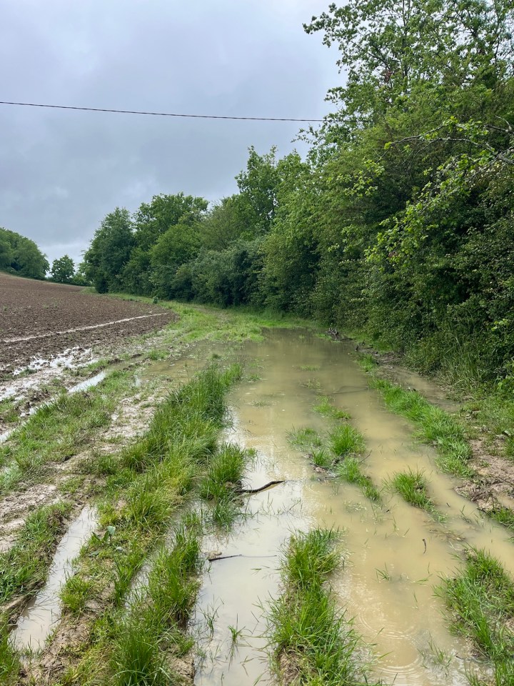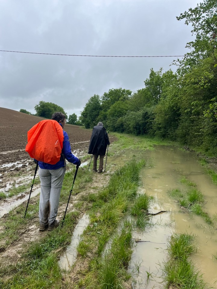 Ensuite direction Condom, 12km dans des conditions difficiles. Les pieds ne sont jamais stables, glissades assurées, les deux bâtons sont indispensables, éviter à tout prix de tomber. Voilà un petit aperçu des types de chemins parcourus. Devrais-je dire patinés ??? On a dû passer des petits rus grossis par l’eau en prenant garde de ne pas y tomber un pied. Le bas des champs ressemblaient à des baignoires : choisir la bonne trajectoire est essentiel. Je valide que mes chaussures sont excellentes : malgré un pied qui s’est enfoncé dans ce que je pensais être une motte « solide », mon pied a disparu sous l’eau. Recommendation : chaussure montante à la cheville, laçage serré mais pas trop, cuir étanche et protégé. Résultat les pieds sont au sec ce soir !! Mais cela a été chaud, et fatiguant de fournir les efforts de maintien en équilibre. Ma maîtrise du patin à glace a dû m’aider dans ce domaine.