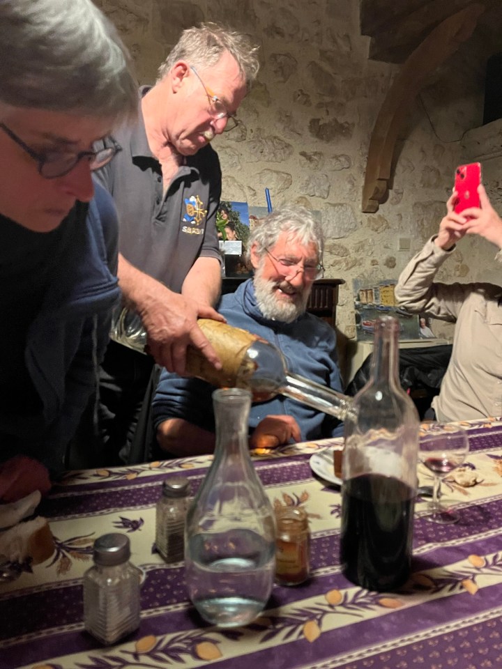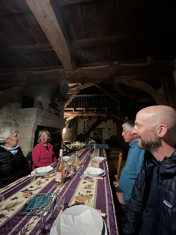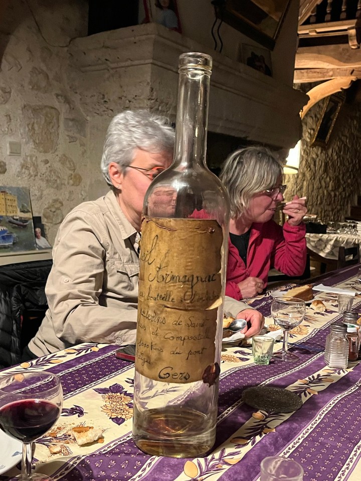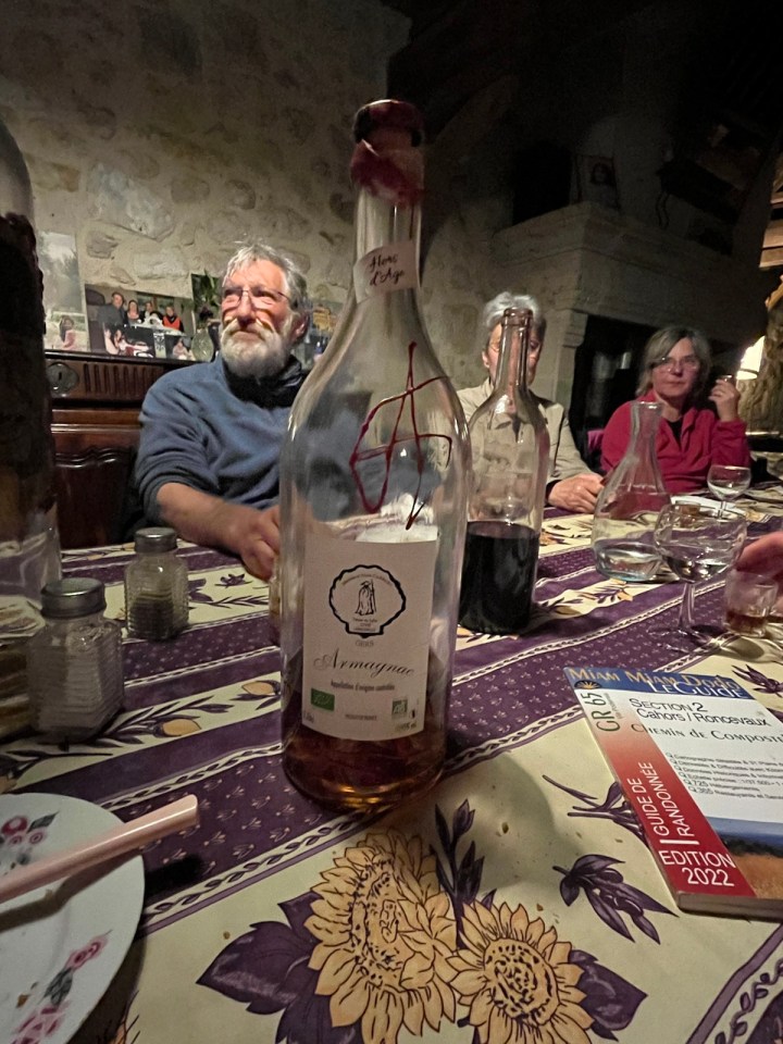 Je vous partage en vrac l’accueil dégustation apéritif qu’il nous a fait à 19h30 avant le dîner. C’est presque inhabituel car le dîner dans les gîtes a lieu plutôt à 19h. Nous avons testé le Flosc de Gascogne, rouge puis blanc et pour finir un armagnac 11 ans d’âge, 57 degrés. Laurent a repéré un jambon en fin de maturation accroché au plafond … Alain ne jure que par les pèlerins du chemin qui viennent aussi faire les vendanges (je vous renvoie à la vidéo). D’ailleurs Jean-Pierre, routier retraité de la région Nantaise, a pris rendez-vous pour les prochaines …