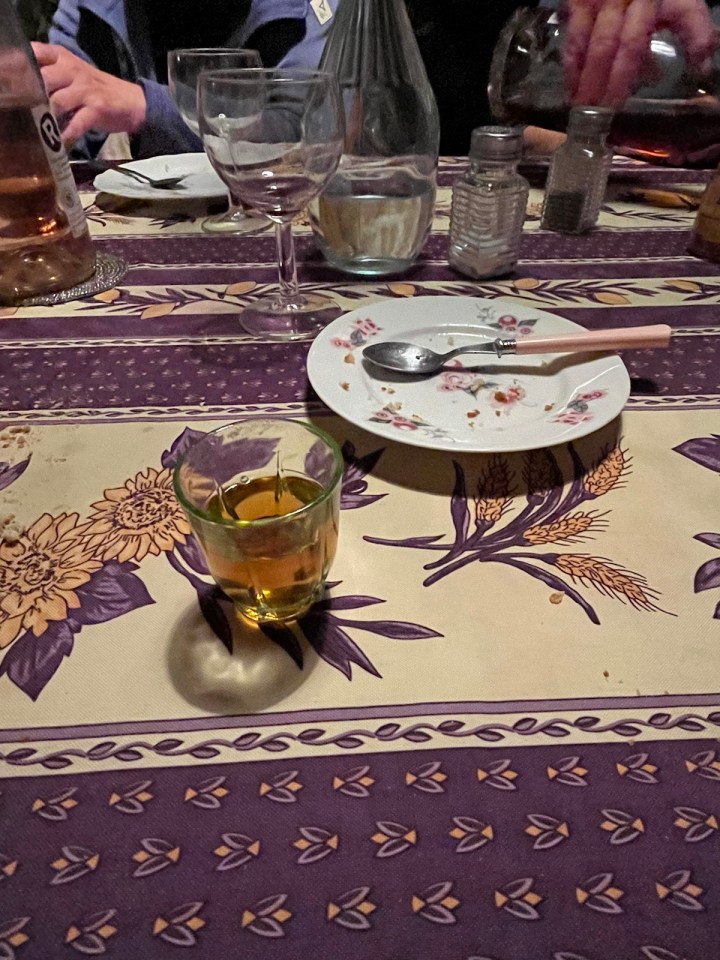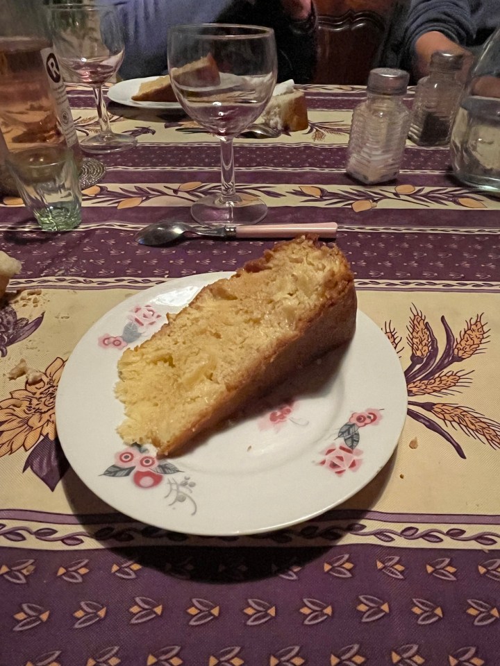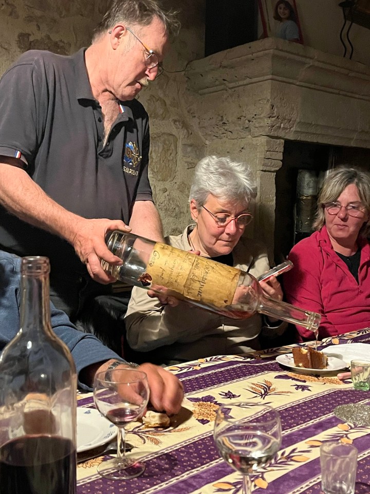Nous avons enchaîné par un dîner dans la maison de Alain et Martine, partagé avec eux. Qui s’est achevé sur un gâteau arrosé de vieil armagnac, la grande bouteille de 3L aux armes de Alain Carrére AC sa marque. Sophie a bien apprécié le gâteau tout comme Jean-Pierre et tous les autres.