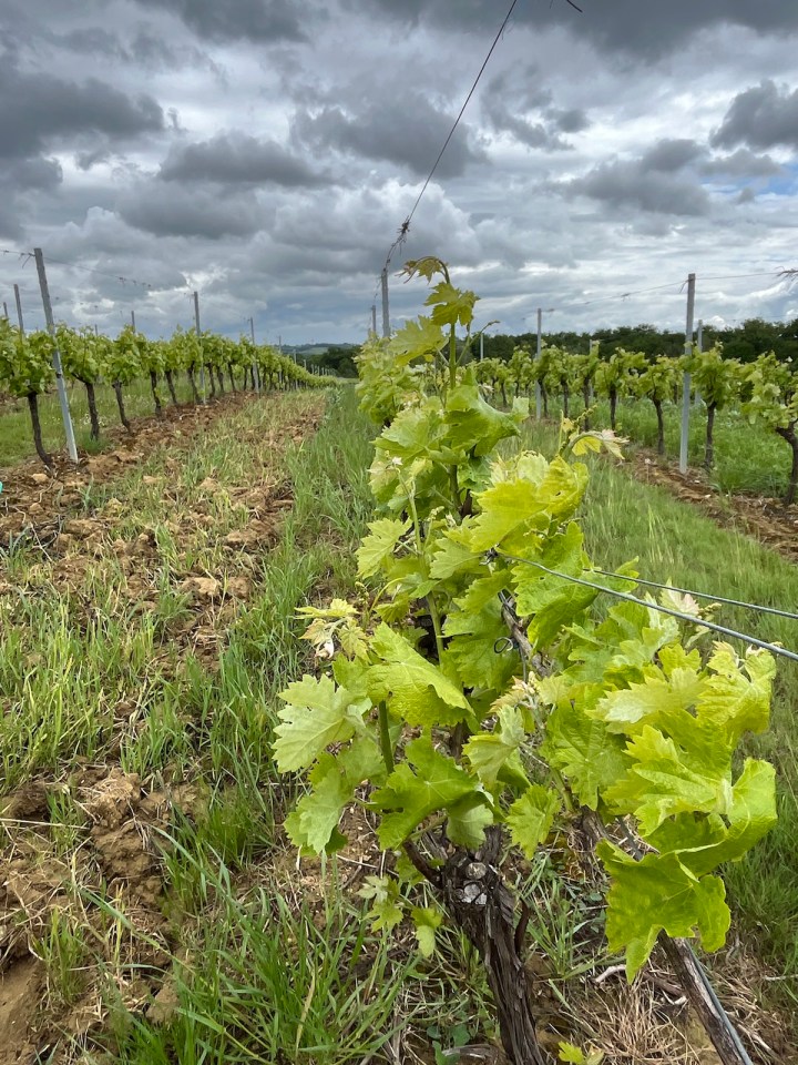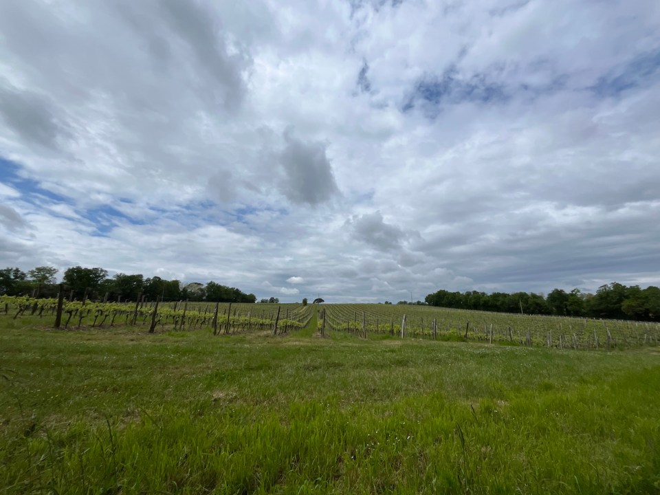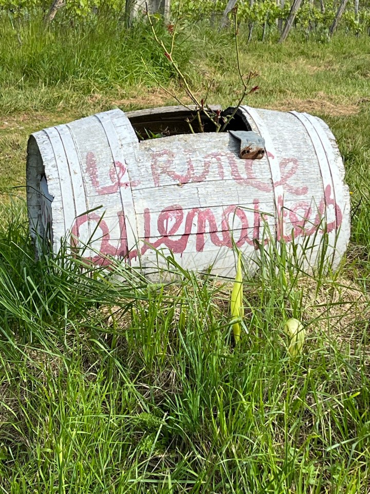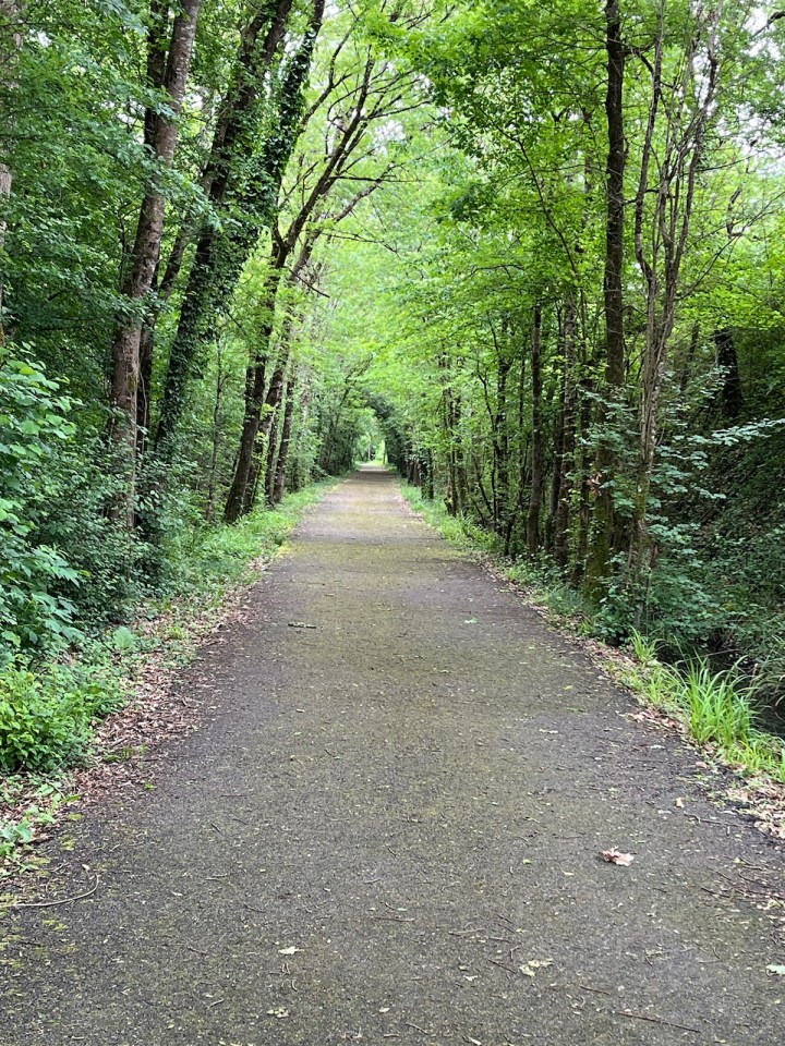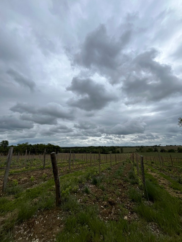 Jusqu’à présent les chemins avaient été à peu près praticables, ce sera moins le cas ensuite. D’abord un petit bout de bitume partagé avec les vélos sur une voie verte très agréable. En sortant de la couverture des arbres je retrouve des champs de vigne de plus en plus grands, avec un ciel encore plus chargé que jamais.