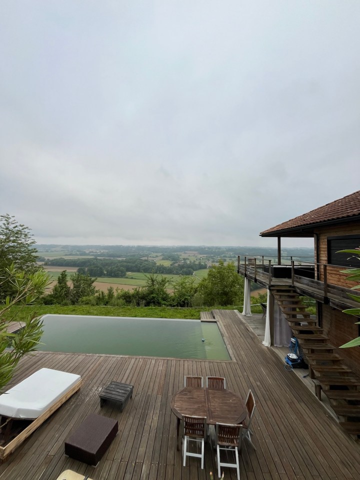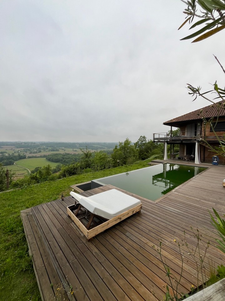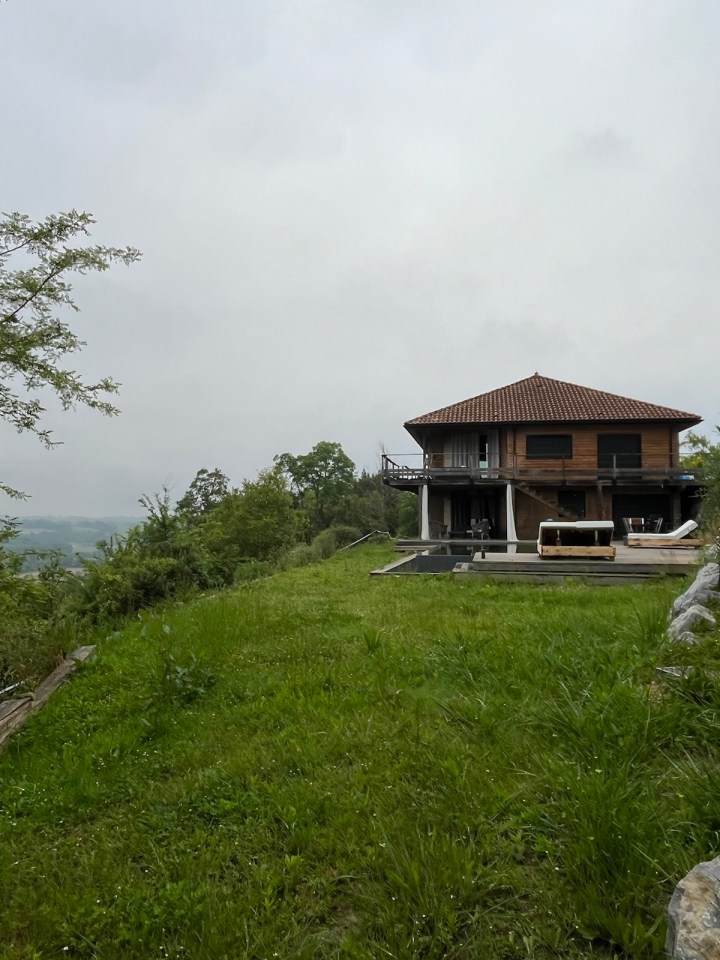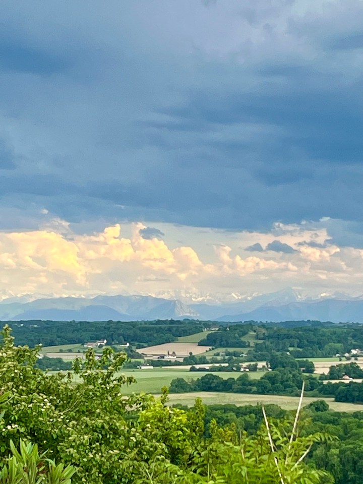 Quoi qu’il en soit aujourd’hui une étape de 20km comme toutes les prochaines à l’exception de mercredi, pas plus de 15, et la dernière samedi avec 25 ou 27 environ. Le temps hier était à l’orage, les nuages se sont accumulés, tonnerre et un peu de pluie. Les montagnes étaient belles au loin. Le gîte était partagé avec Béatrice, barcelonaise parisienne au français parfait. Irene, notre hôte, nous a chouchouté avec un super dîner et un accueil très chaleureux. Encore un gîte vraiment agréable et plaisant. Après le petit déjeuner bien copieux pour tenir la matinée, départ sous un ciel gris et bas, pas de pluie annoncée. Température clémente, tee-shirt de mise. A la sortie du village de Pimbo il y a une superbe villa avec piscine et vue dégagée sur la vallée et les Pyrénées au fond, cachés par la grisaille ce jour.