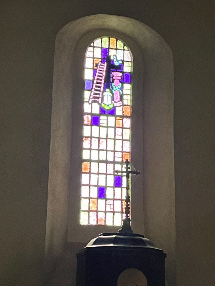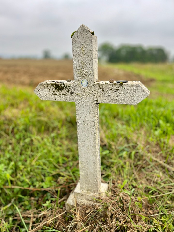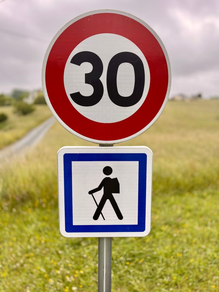 L’église de Louvigny doit être une construction très récente, moderne de l’extérieur, petite et fonctionnelle. Est ce une chapelle plutôt ? Je ne suis pas expert en la matière … en tout cas pas de miracle le ciel est toujours chargé et je sens comme une bruine très fine parfois. Les autorités locales ont pris soin de prévenir les véhicules de la présence des marcheurs. Je le précise car ce panneau ne signifie pas «  pas plus de 30 marcheurs » ni même «  vitesse maxi 30 pour les marcheurs » !!