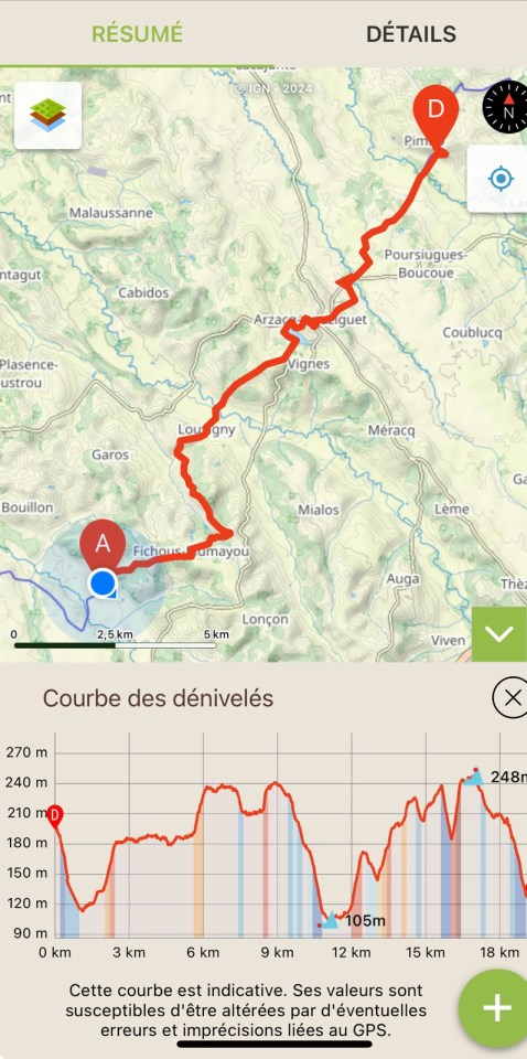 20km tout rond, en un peu moins de 5h dans la matinée je n’ai pas traîné pour atteindre le gîte à la ferme de Larreule. L’approche du retour se fait sentir quoi que j’en dise … Je goûte une bonne bière pression locale méritée avant de rédiger cet article et repos avant le dîner. Bonne nouvelle ce soir j’ai eu Thierry au téléphone, on se retrouve demain au gîte de l’étape, il a filé vite, c’est sympa et j’ai hâte d’y être.