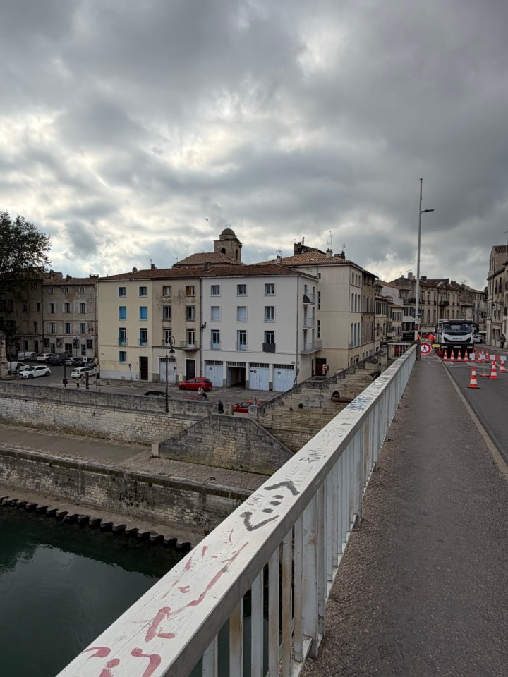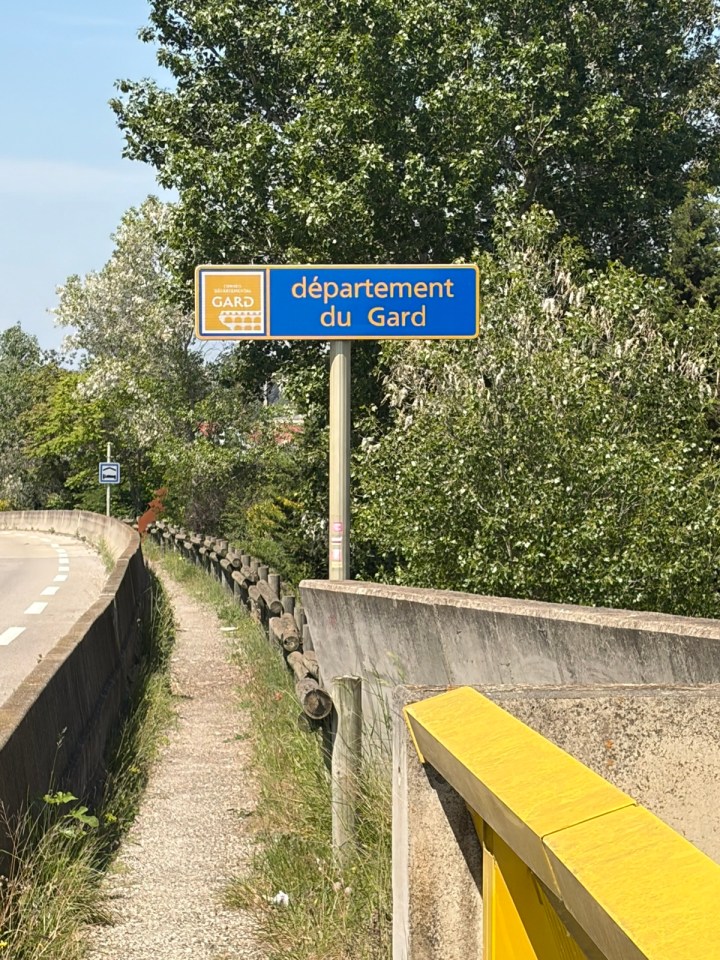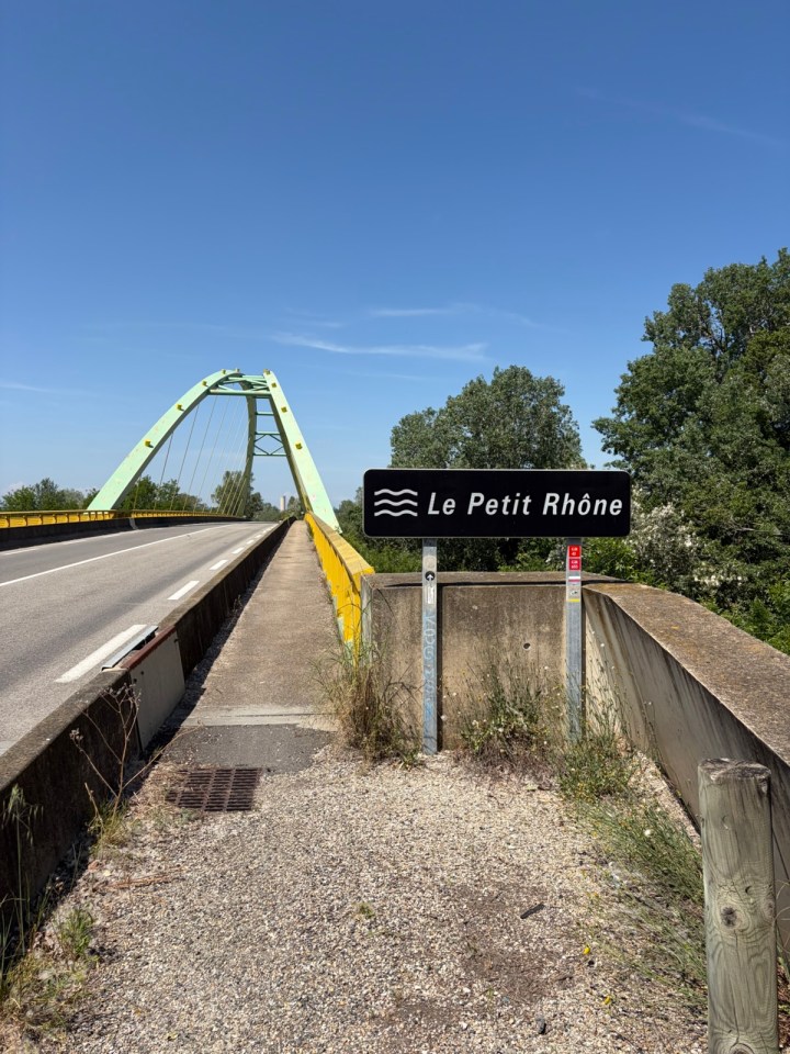 En traversant le petit Rhône pour me retrouver sur la bonne rive vers St Gilles je charge de département, c’est le Gard désormais après les Bouches du Rhône. Et je croise une silhouette familière.