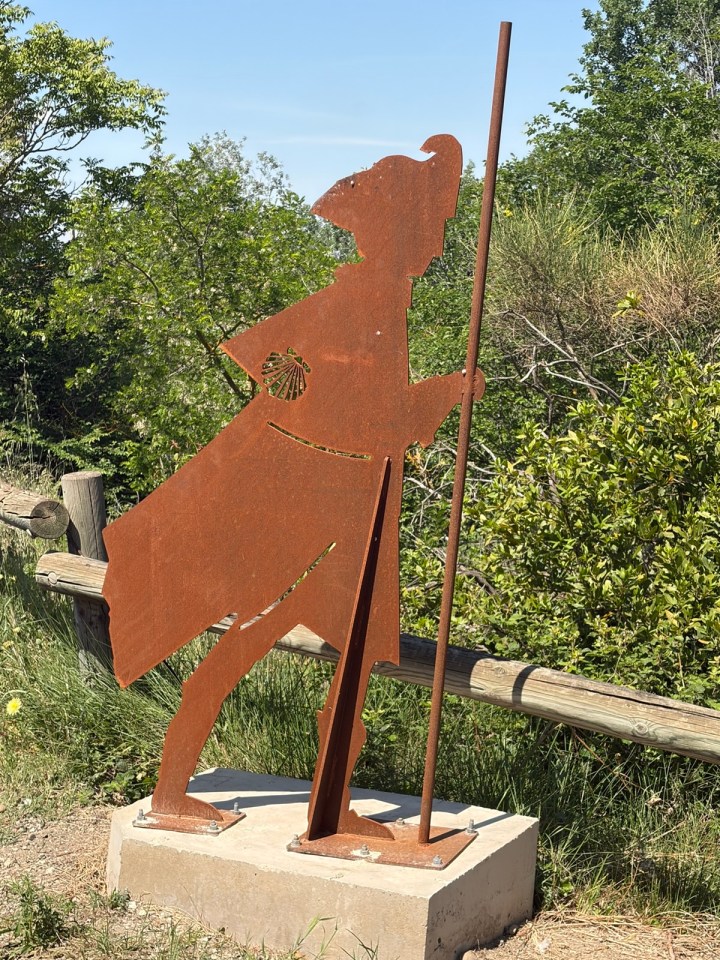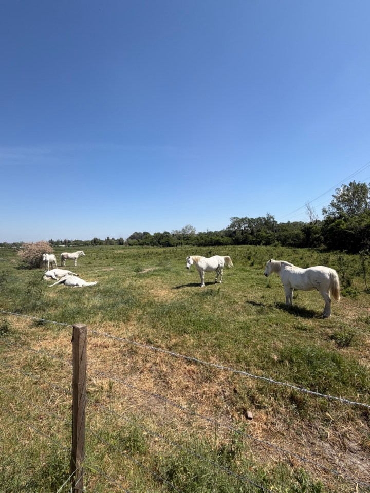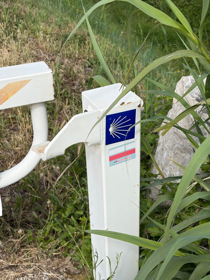 Première coquille du chemin vers compostelle trouvée sur une des nombreuses barrières bloquant l’accès à la digue. En contre bas de la digue il y a de temps en temps des mas, fermes des cultivateurs locaux, et aussi cette très belle villa avec piscine … La chaleur me donne envie d’y plonger mais c’est déjà l’heure du dej et de la pause. 13km parcourus à midi c’est bien. L’ombre d’un arbre apporte un peu de répit avec le soleil mais ils sont bien rares.