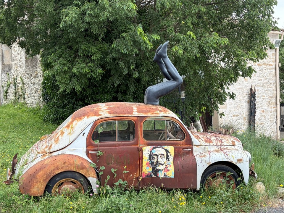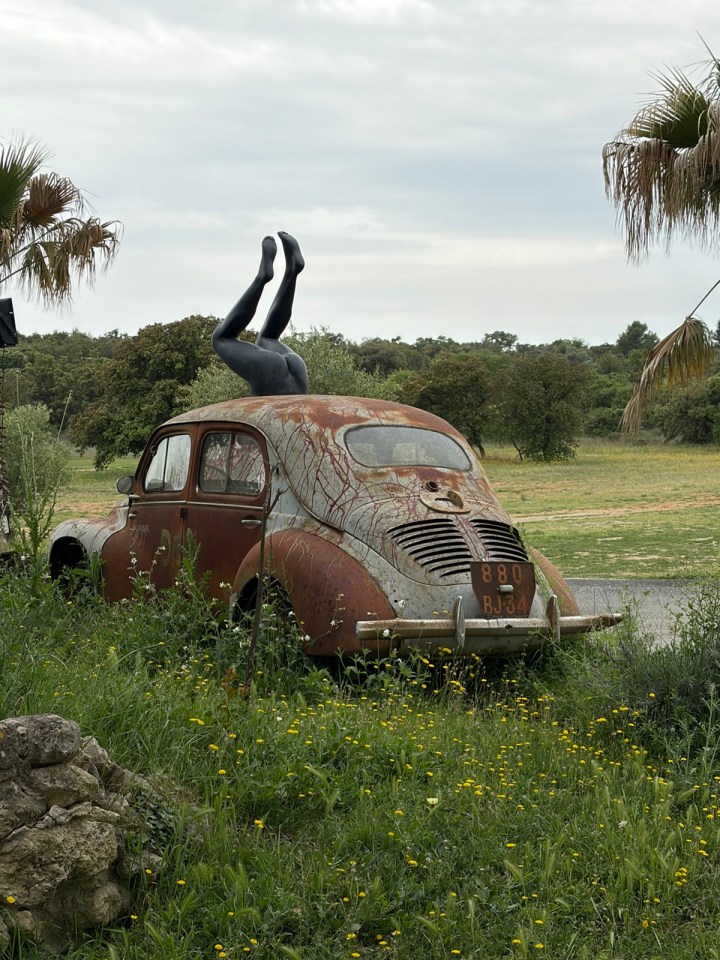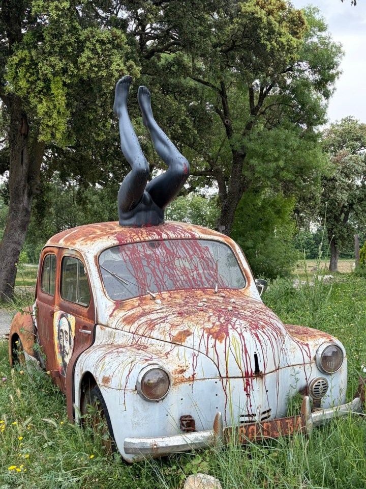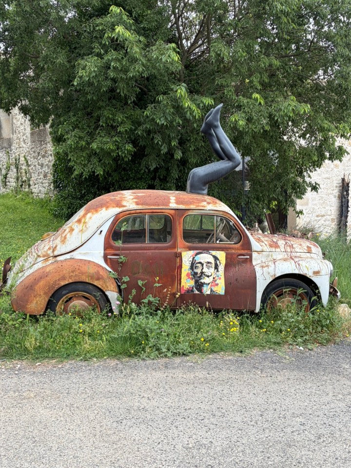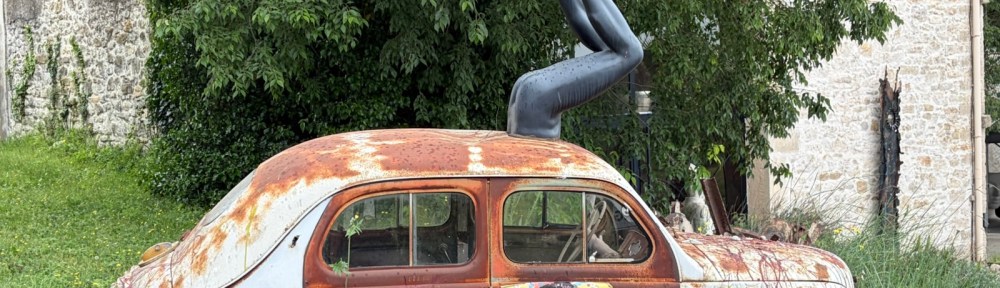 Au détour de la route je tombe sur un restaurant qui fait atelier d’artistes et réceptions/banquets. Une vieille dauphine (c’est bien ce modèle de voiture ?) a été reconvertie en œuvre : bon je cherche le sens du message … vos propositions sont les bienvenues.